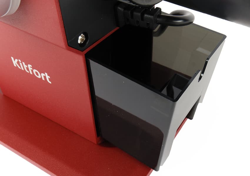 Хочется похвалить конструкцию KT-2110-1: она легкая, компактная — для нее нетрудно найти место в кухонном шкафчике. Высота загрузочного блока позволяет использовать большую посудину для фарша. Отличная идея — ящичек для шнура и насадок в корпусе: выдвинул, сложил, задвинул — минимум телодвижений. Один минус — узкая горловина: мясо придется нарезать помельче.
