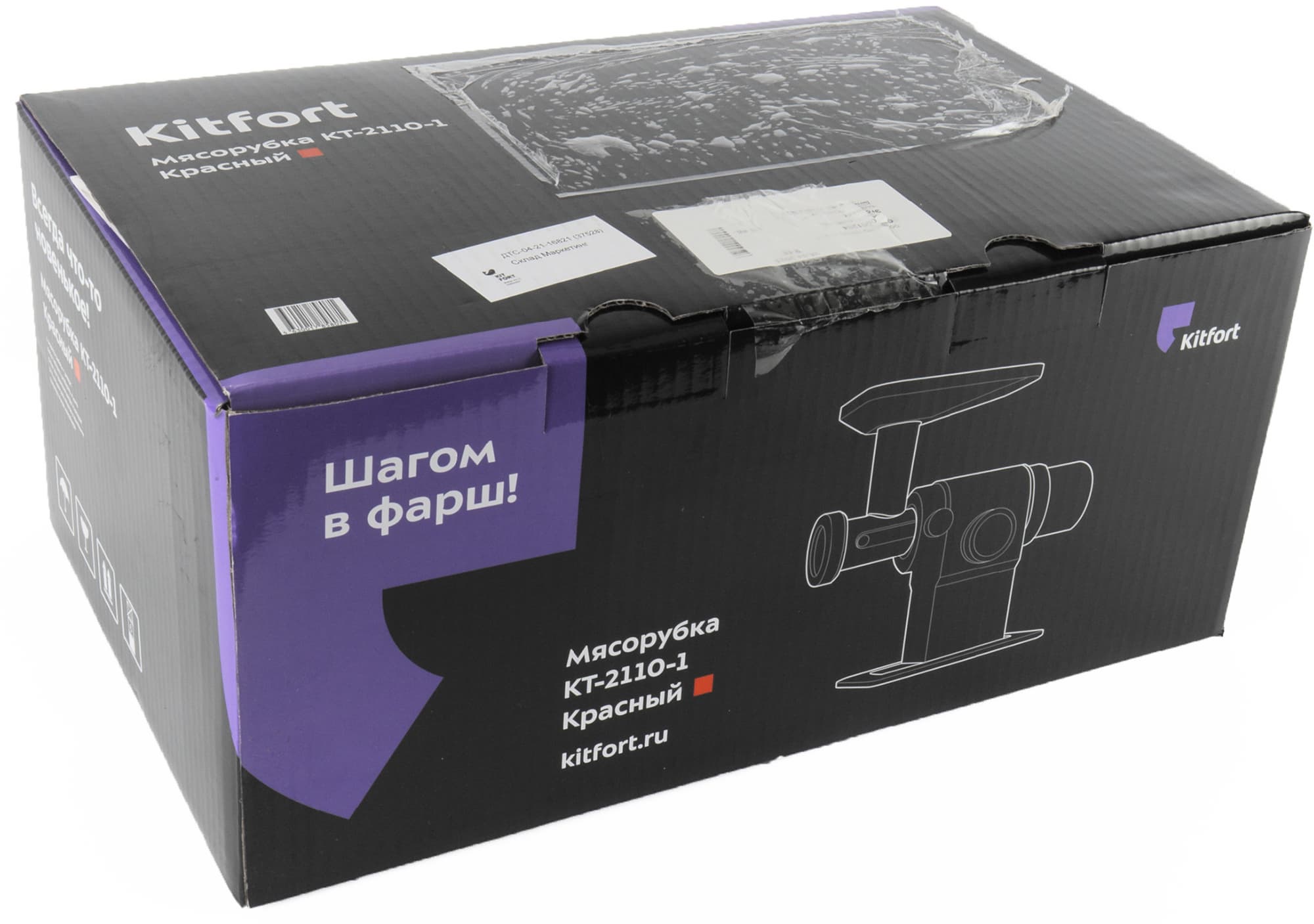 Мясорубка упакована в коробку характерной для Kitfort расцветки: черный с фиолетовым. В правом углу — векторное изображение прибора, в левом верхнем — традиционный броский слоган. «Шагом в фарш!» — ассоциации у нас возникли не совсем кулинарные, вспомнился известный клип Pink Floyd.