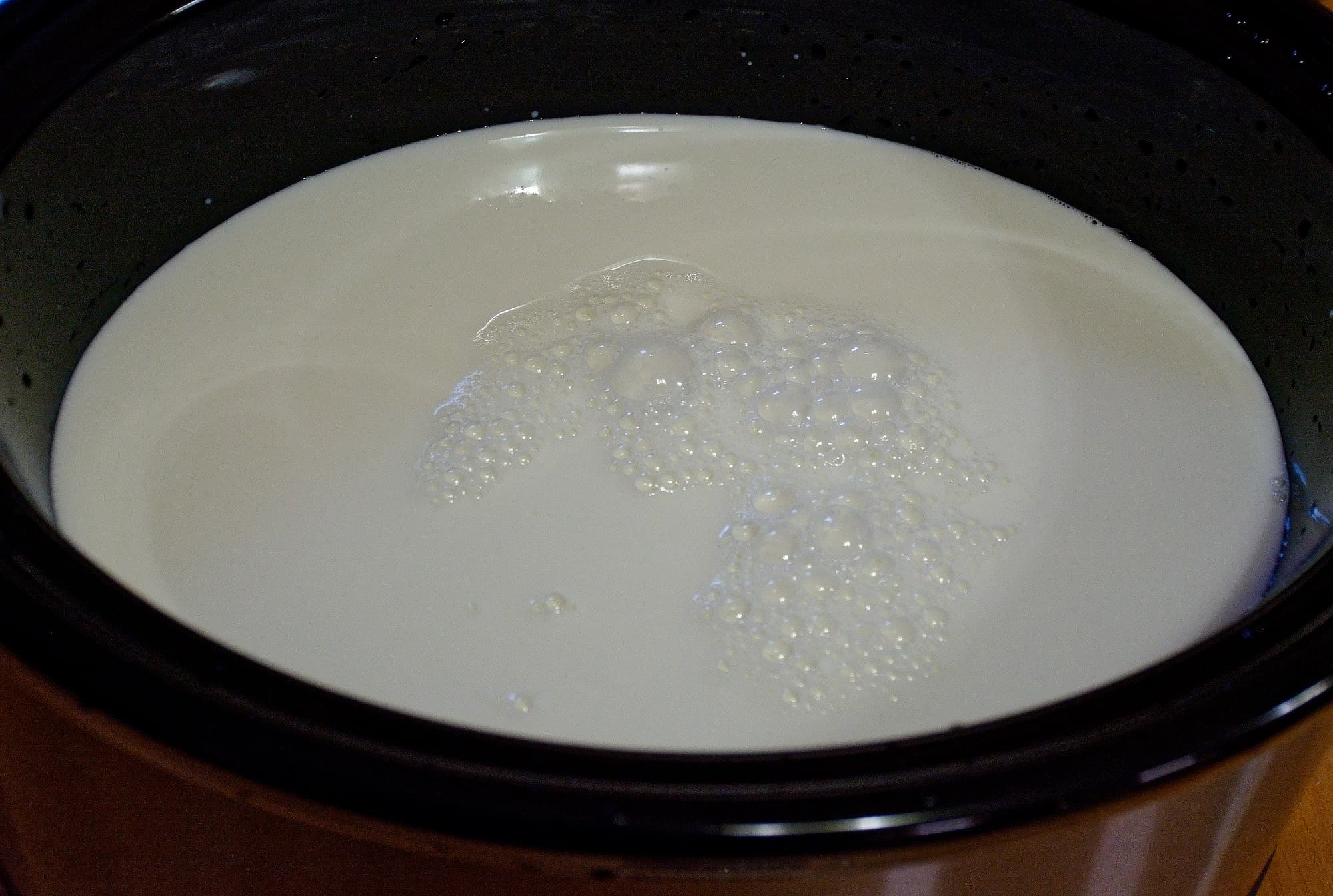 Топленое молоко можно делать в медленноварке, и мы решили попробовать. Температура не доходит до ста градусов и молоко точно не убежит, а большая площадь поверхности помогает периодически утапливать образующиеся румяные пенки, бесценные при приготовлении из такого молока ряженки (варенца).