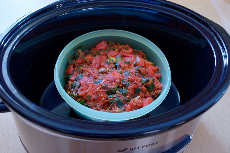 Мы в качестве емкости использовали пластиковый контейнер. Экспериментировали с овощами: нажарили кабачков, пересыпали чесноком и зеленью, сверху положили слой помидоров, тоже жареных. Все это богатство мы собирались взять с собой на загородный пикник, планировавшийся аж в 500 километрах от места тестирования.