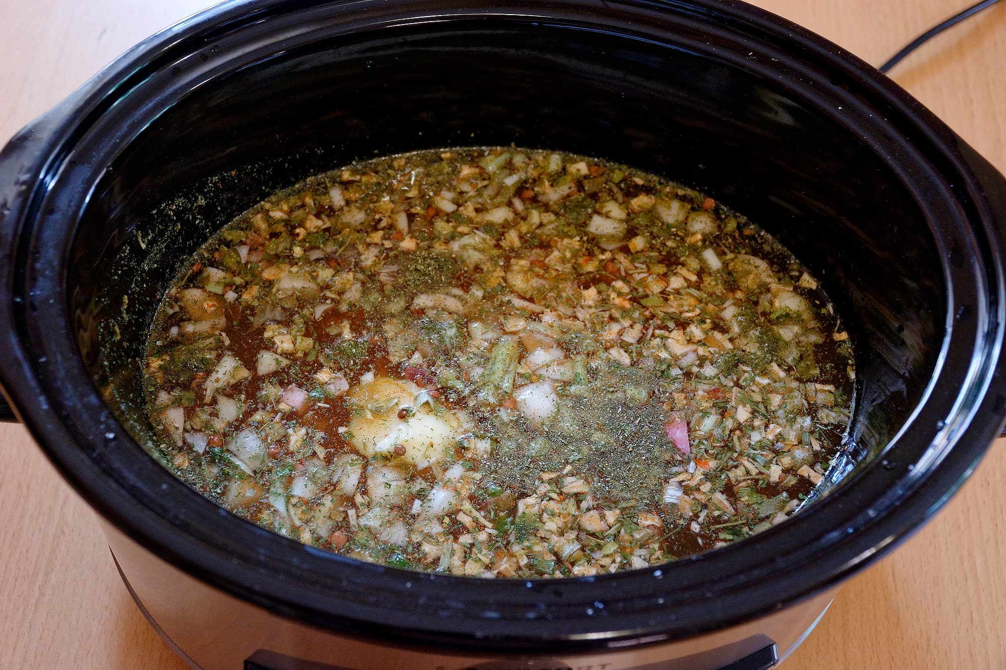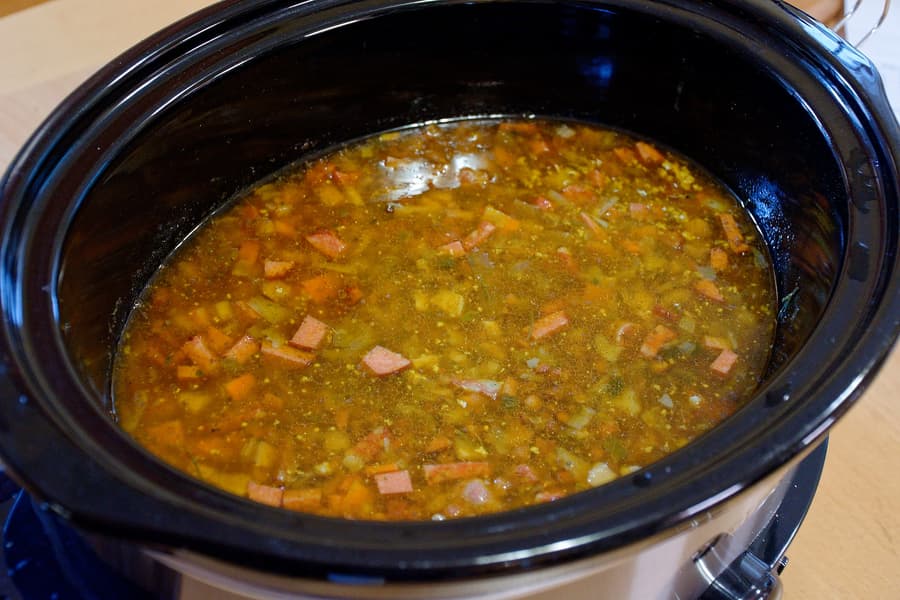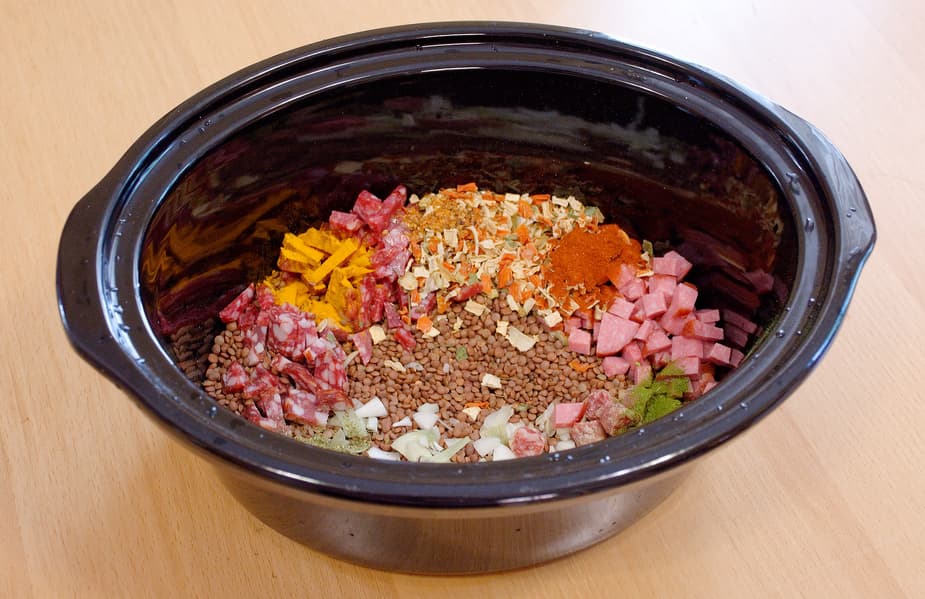 Если где-то и существует Ленивица из сказки «Морозко», то это блюдо для нее. Мы взяли упаковку в полкилограмма чечевицы, высыпали ее в керамическую чашу медленноварки. Добавили туда несколько видов копченостей, сырой лук, соль, сухую зелень, большую горсть сушеных корнеплодов и несколько специй: молотый лавровый лист, копченую паприку, куркуму и молотый чили.