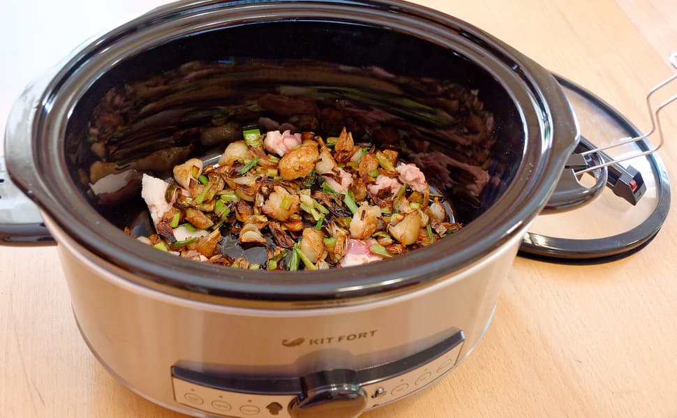 Для начала мы срезали немного наружного жира с бараньей ножки и обжарили на нем с десяток молодых луковиц — для придания аромата будущему блюду. Переложили со сковородки в медленноварку и стали заполнять ее дальше.