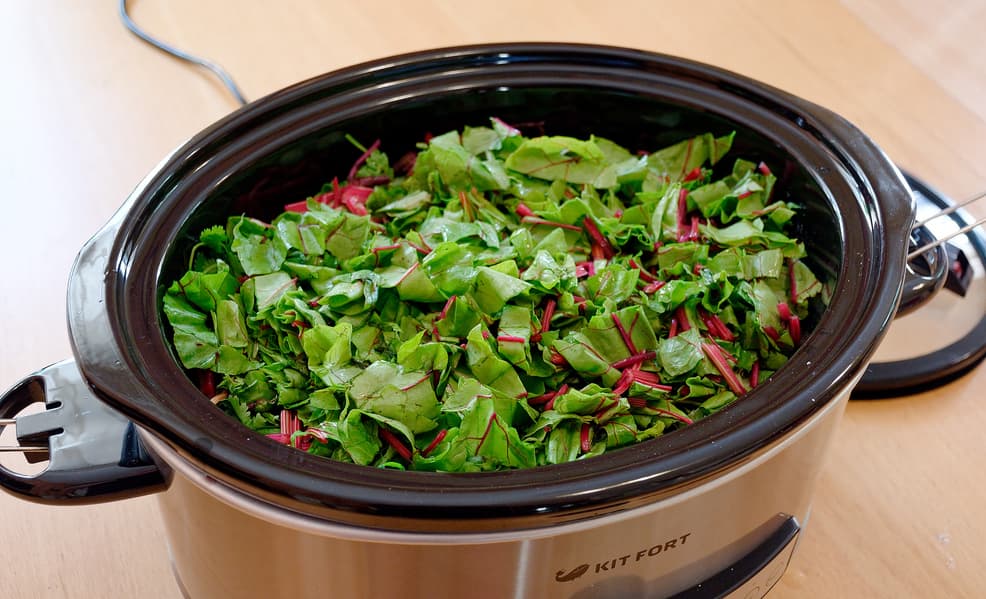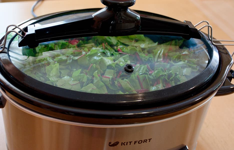 И немного промахнулись: данные по нагреву в инструкции, видимо, измерялись при куда более полной чаше, которую надо было нагреть гораздо больше. Открыв крышку, мы уже через два часа обнаружили, что наши овощи кипят. Это оказалось все равно вкусно, да и хранились они отлично, но внешний вид и аромат чеснока и зелени пострадали относительно задуманного.
