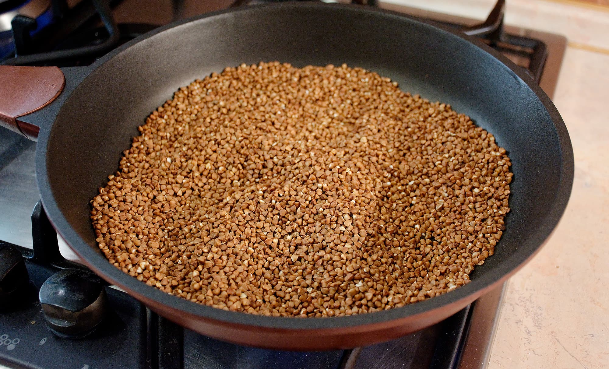 Сначала мы прокалили крупу на сковородке. Она, конечно, и из магазинной упаковки не зеленая, но дополнительное прокаливание сделает вкус лучше.
