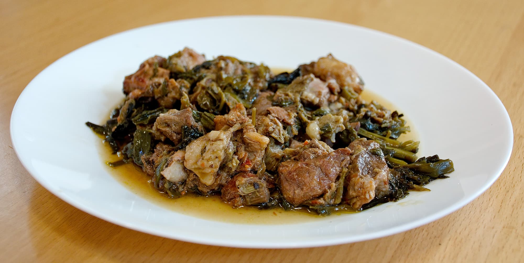 Через восемь часов нашему взору предстало нежное, сочное мясо с зеленью. Объем уменьшился раза в три, и основную роль в блюде заиграло мясо, а не тот стог зелени, которого мы немного опасались при закладывании.