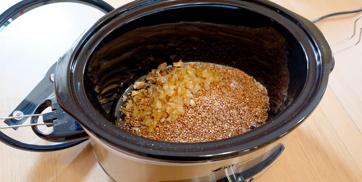 В медленноварку сложили грибы, лук, гречку, соль. Добавили воды и поставили на 8 часов на «Low».