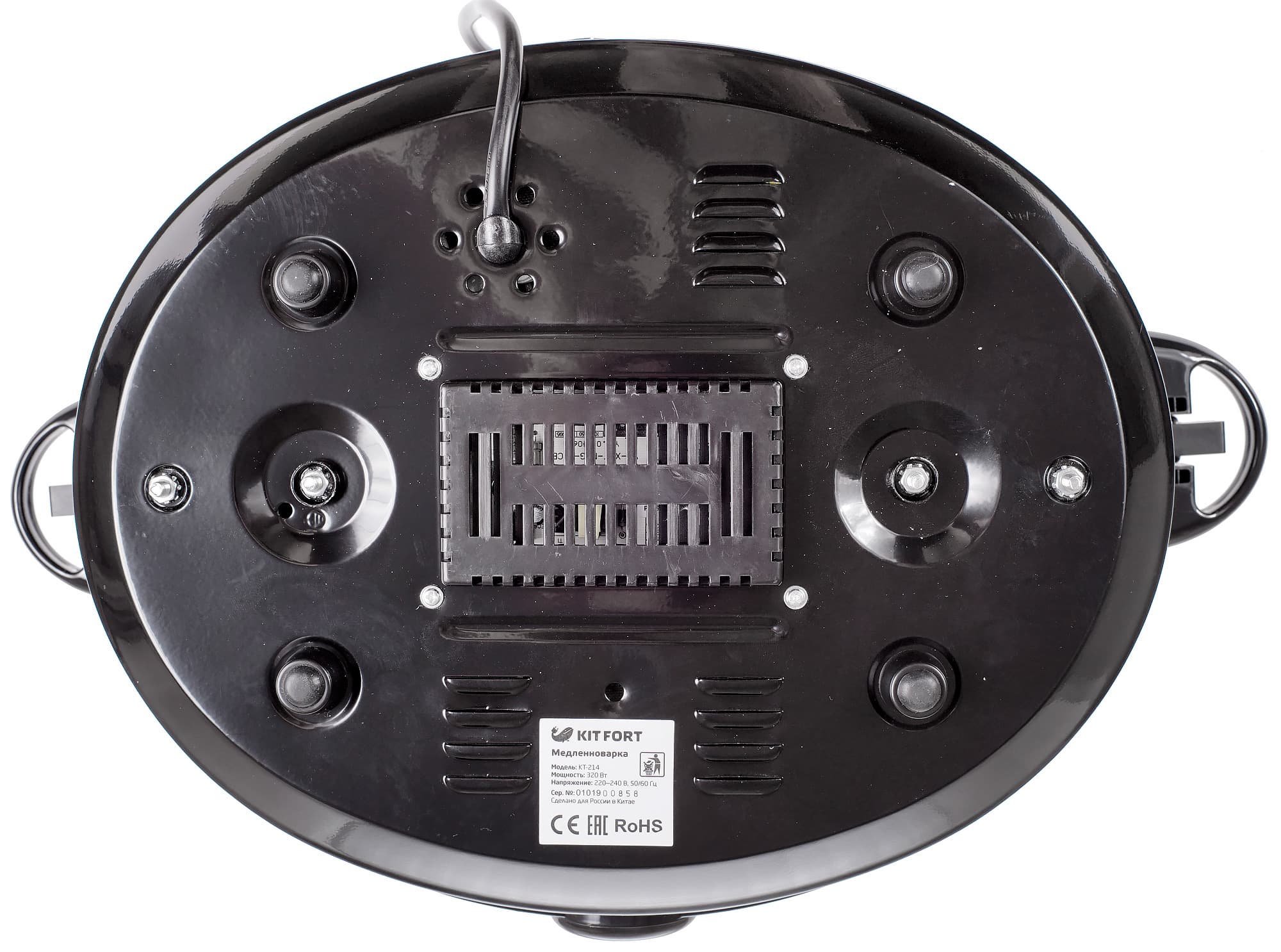 На дне находятся 4 ножки с прорезиненными окончаниями и многочисленные вентиляционные отверстия. Дно пластиковое.