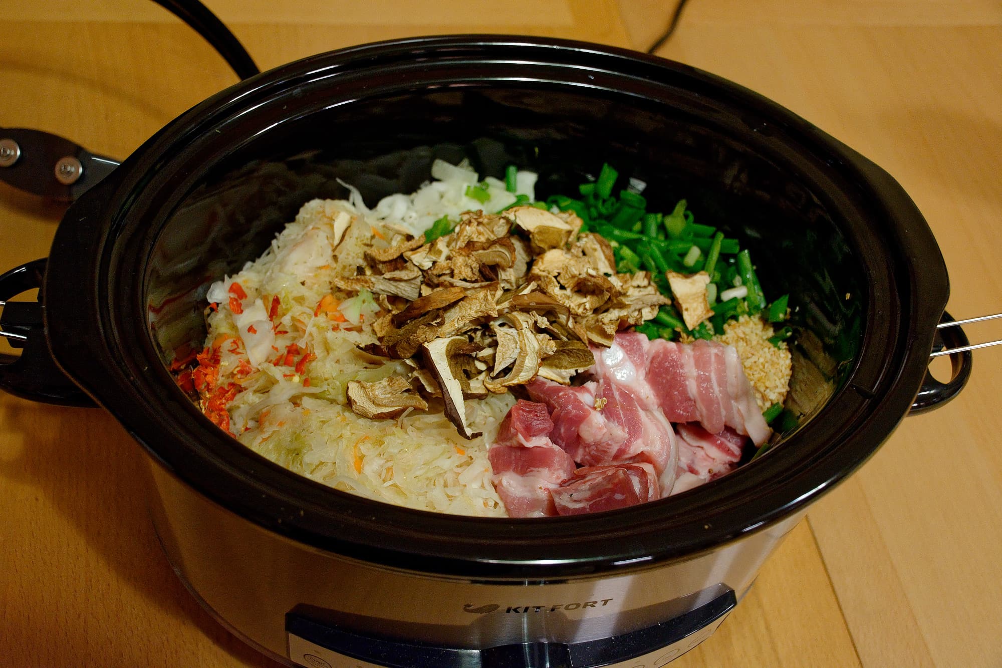 Где каша, там и щи. Взяли следующий набор: квашеная капуста, свиная грудинка, лук репчатый и зеленый, чеснок, перец и белые сушеные грибы. Налили воды и проставили на «Low» на 10 часов.