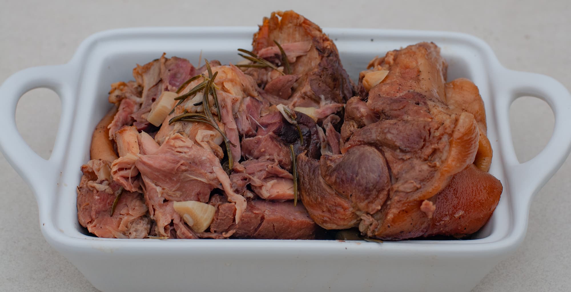 Рульки натерли солью с перцем, уложили в кастрюлю медленноварки, поставили режим слабого нагрева на 4 часа. Через 4 часа перевернули рульки, переставили режим на сильный нагрев и продержали мясо еще около 4 часов. Аккуратно вынули кости, стараясь не повреждать шкуру, пересыпали мясо нарезанным чесноком и положили сверху несколько маленьких веточек розмарина. Поставили еще на один час. Достали.