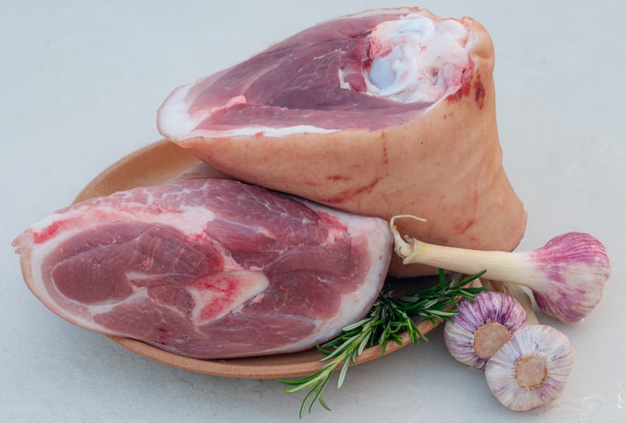 Для блюда мы взяли свиные рульки, чеснок, черный перец и немного розмарина.