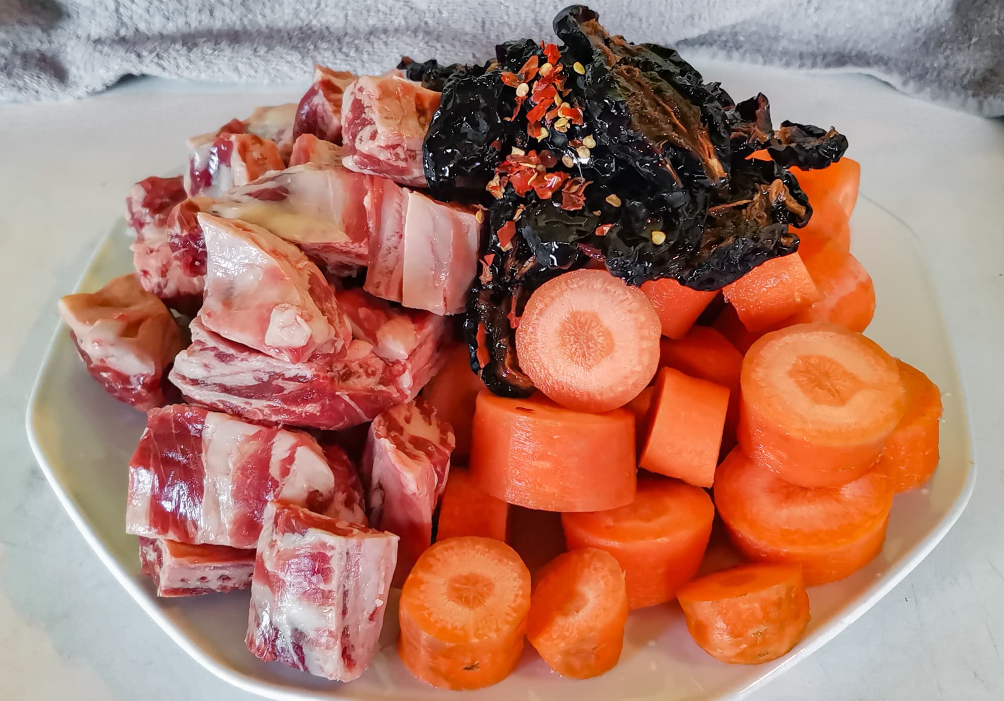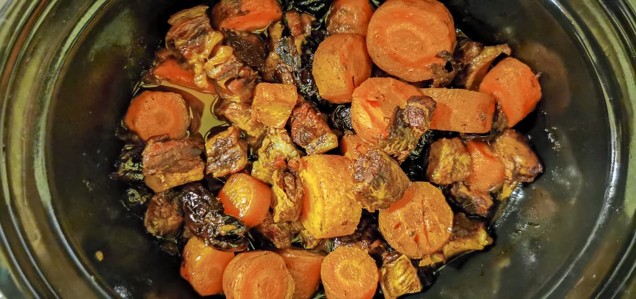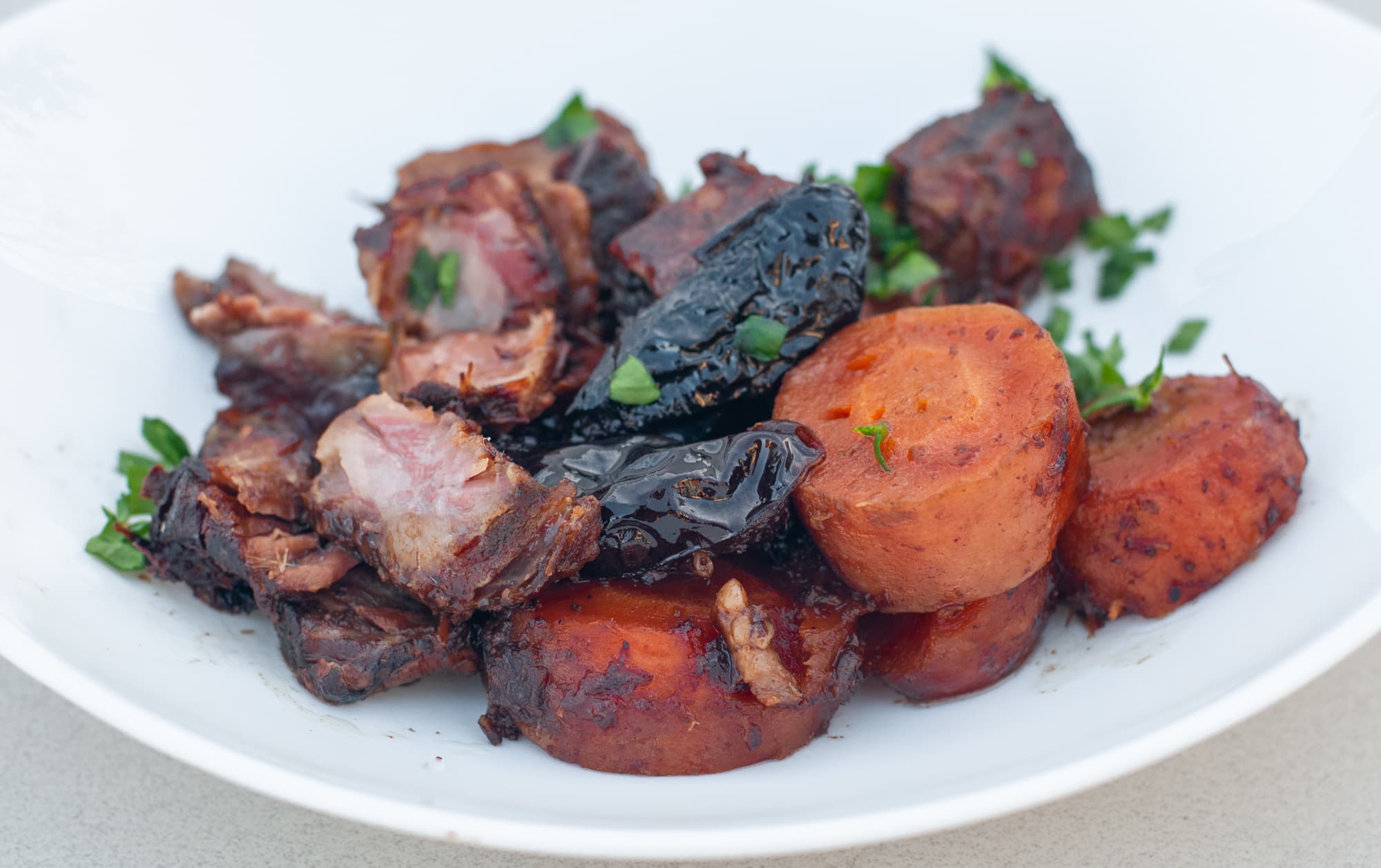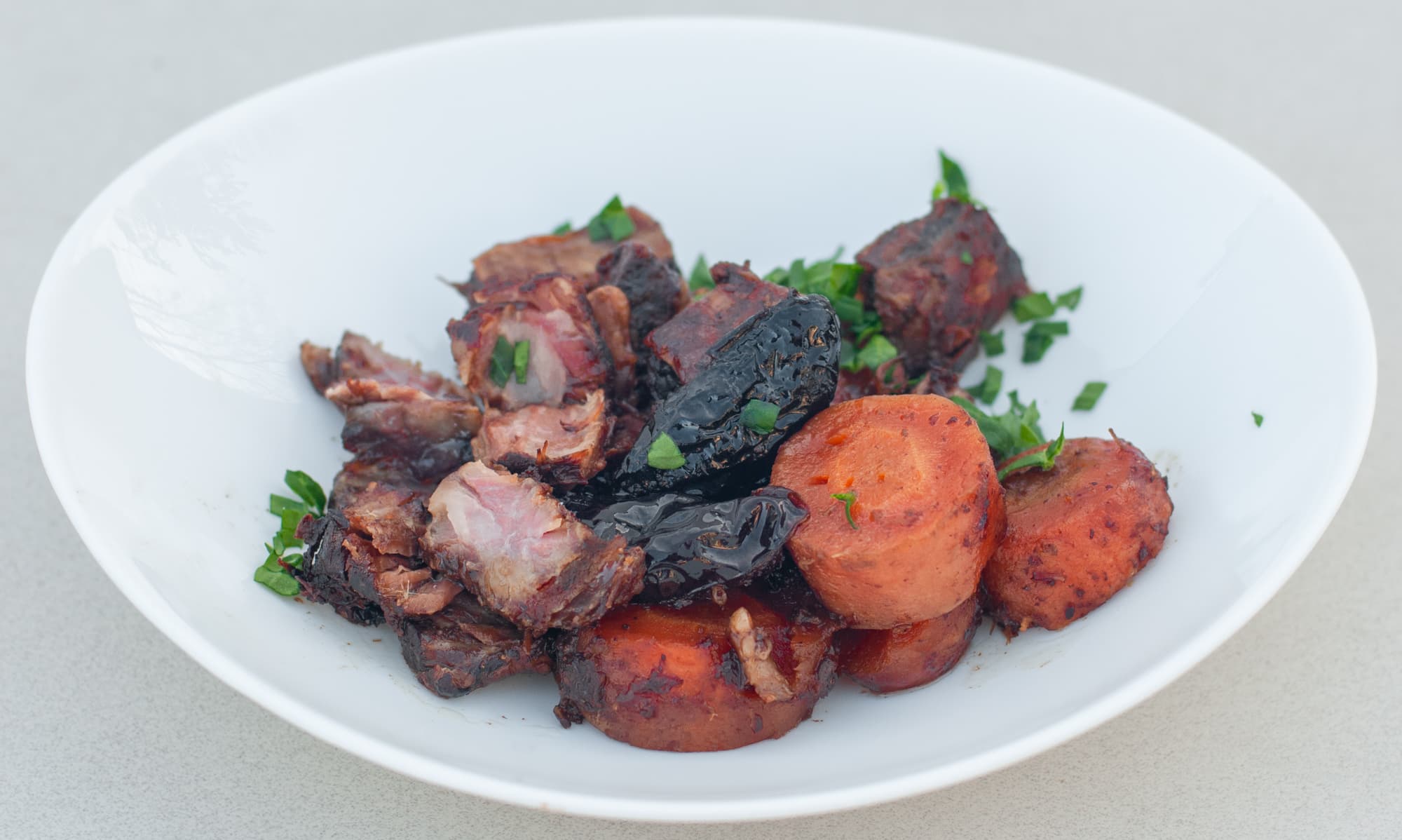Мы взяли говяжьи ребра, вырезали межреберное мясо, порезали на небольшие куски. К мясу добавили морковь, натуральный несладкий чернослив, острый дробленый перец и соль. Все продукты уложили в емкость, выставили режим сильного нагрева на 8 часов.