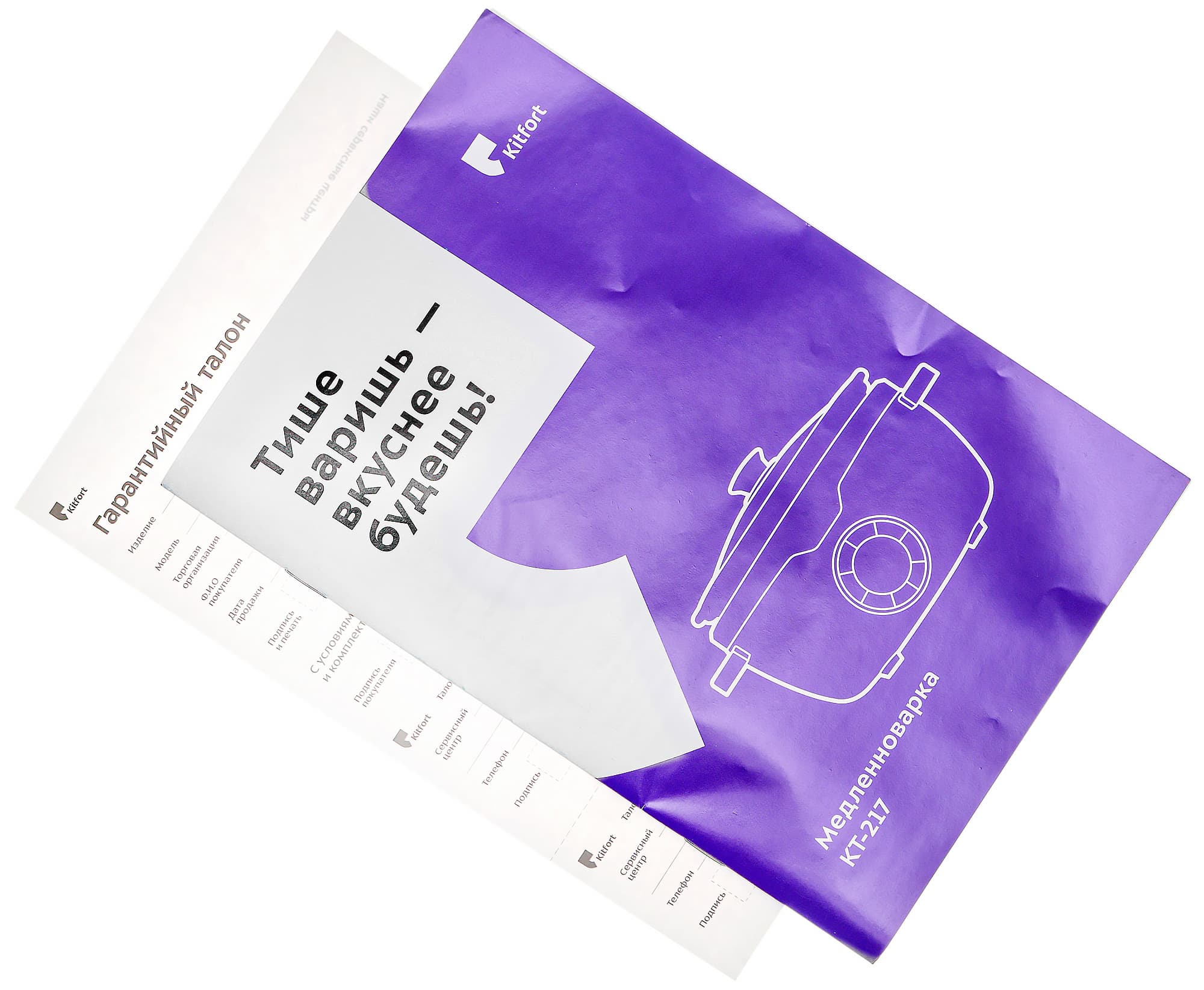 Руководство по эксплуатации представляет собой брошюру на 22 страницах с подробным описанием прибора и его техническими характеристиками. Также в нем есть раздел рецептов и общих советов по использованию медленноварки.