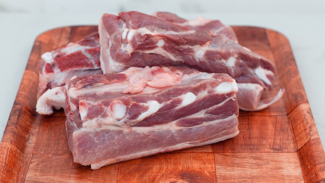 Мы взяли куски грудинки, преимущественно с хрящами, а не с костями. Не снимая шкуру, натерли грудинку солью с красным перцем, уложили плотно в кастрюлю.