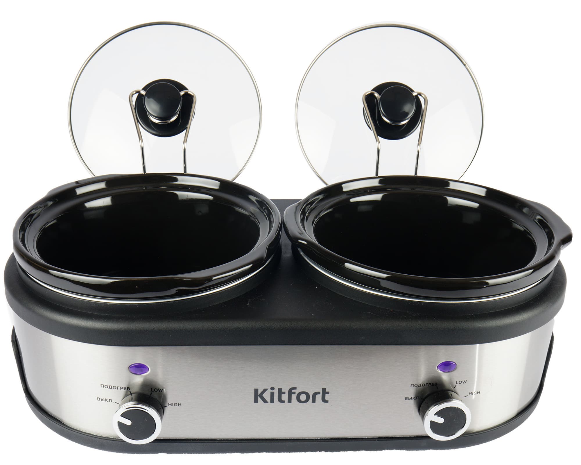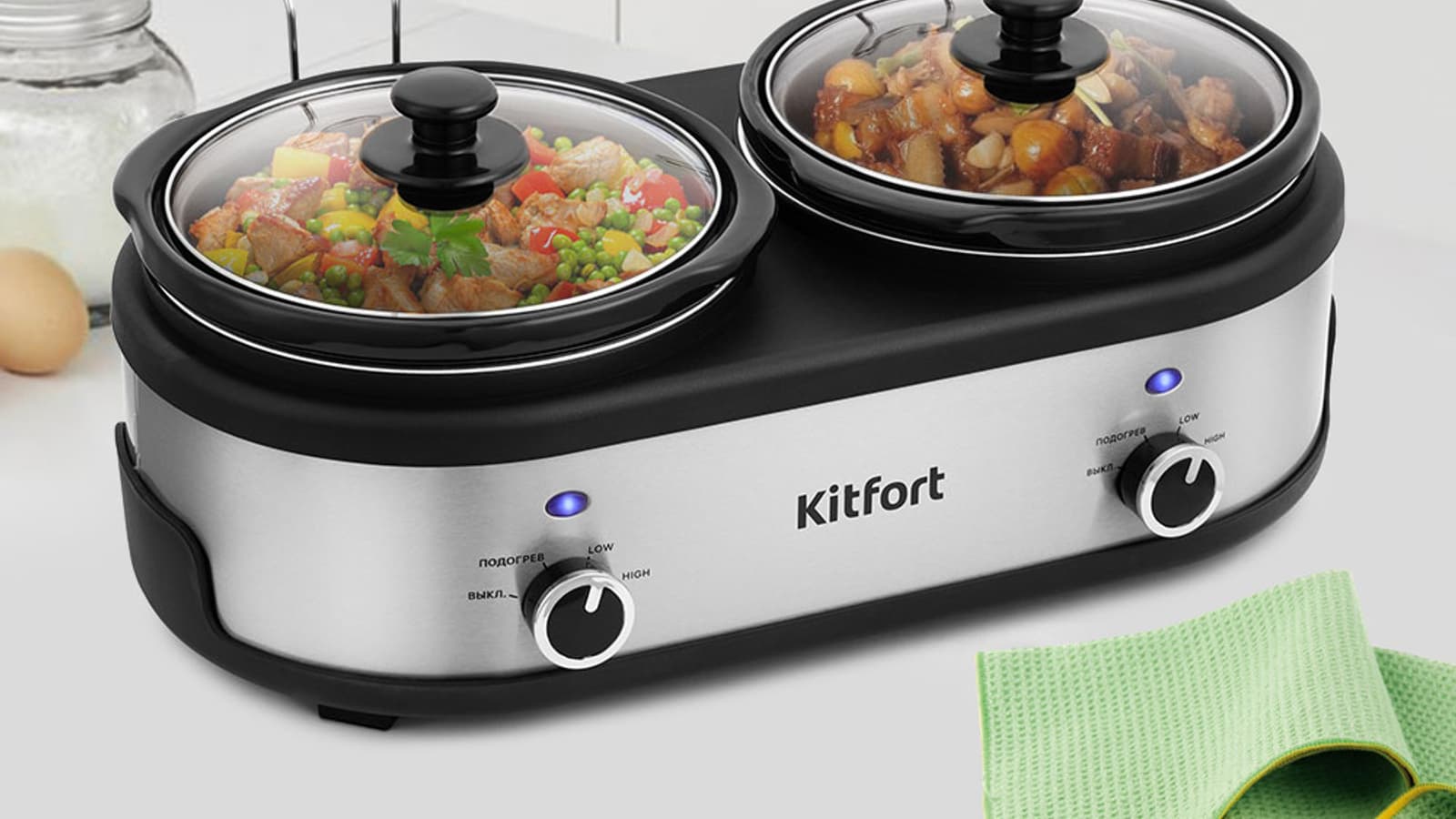 Сегодня мы протестируем медленноварку Kitfort КТ-219 с двумя кастрюлями. Данный агрегат готовит блюда особым способом — томлением. Производитель сообщает, что температура приготовления находится в диапазоне 60—120 °C. Благодаря керамической кастрюле пища равномерно нагревается со всех сторон. Нагреватель расположен по периметру в нижней части емкости для хорошего распределения тепла.