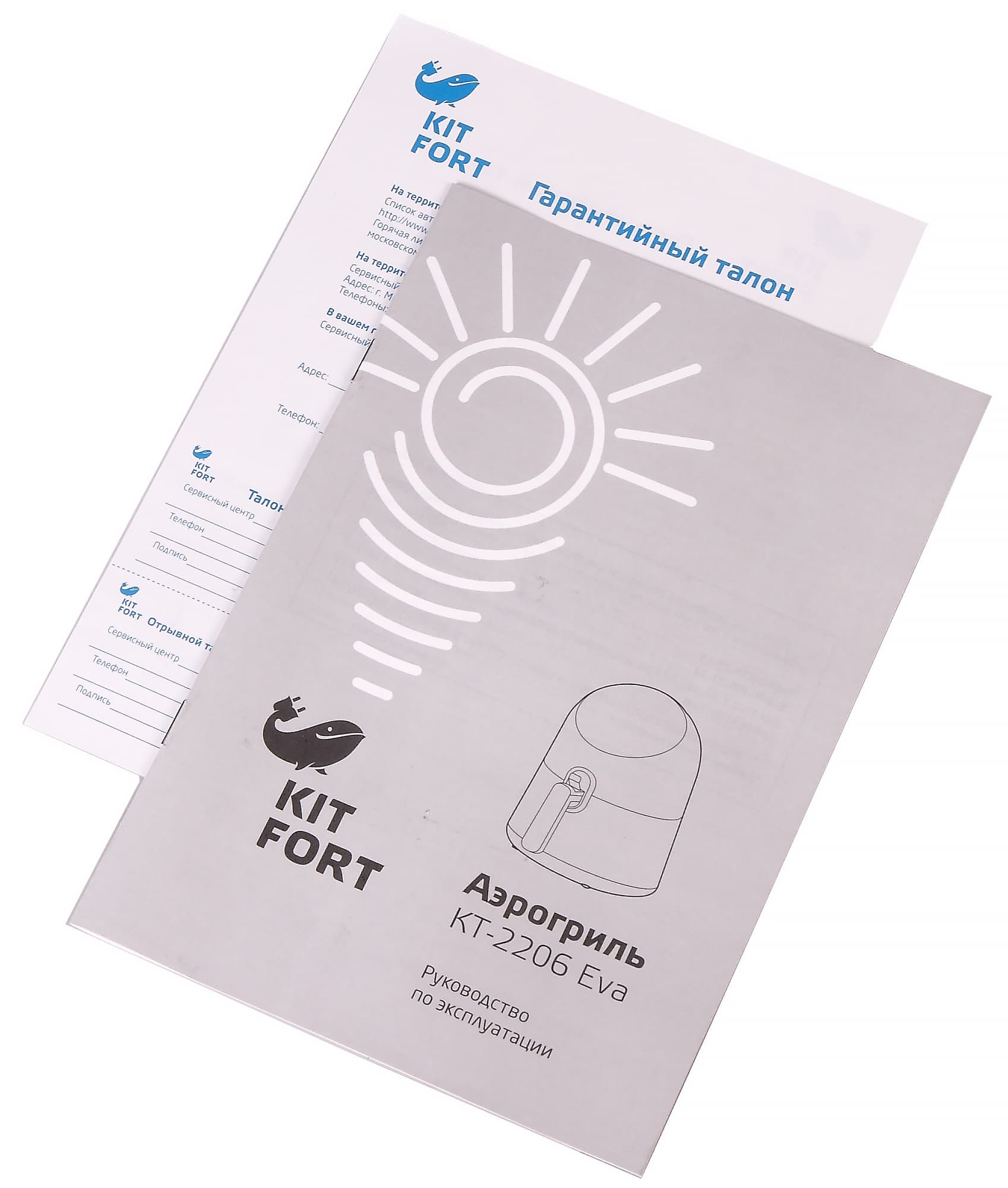 Внутри коробки между двух картонных вставок находится аэрогриль в сборе и бумажки: гарантийный талон, руководство пользователя и рекламный буклет. При открытии коробки обращает на себя внимание красная наклейка с призывом задавать любые вопросы по эксплуатации прибора прежде, чем ломать.