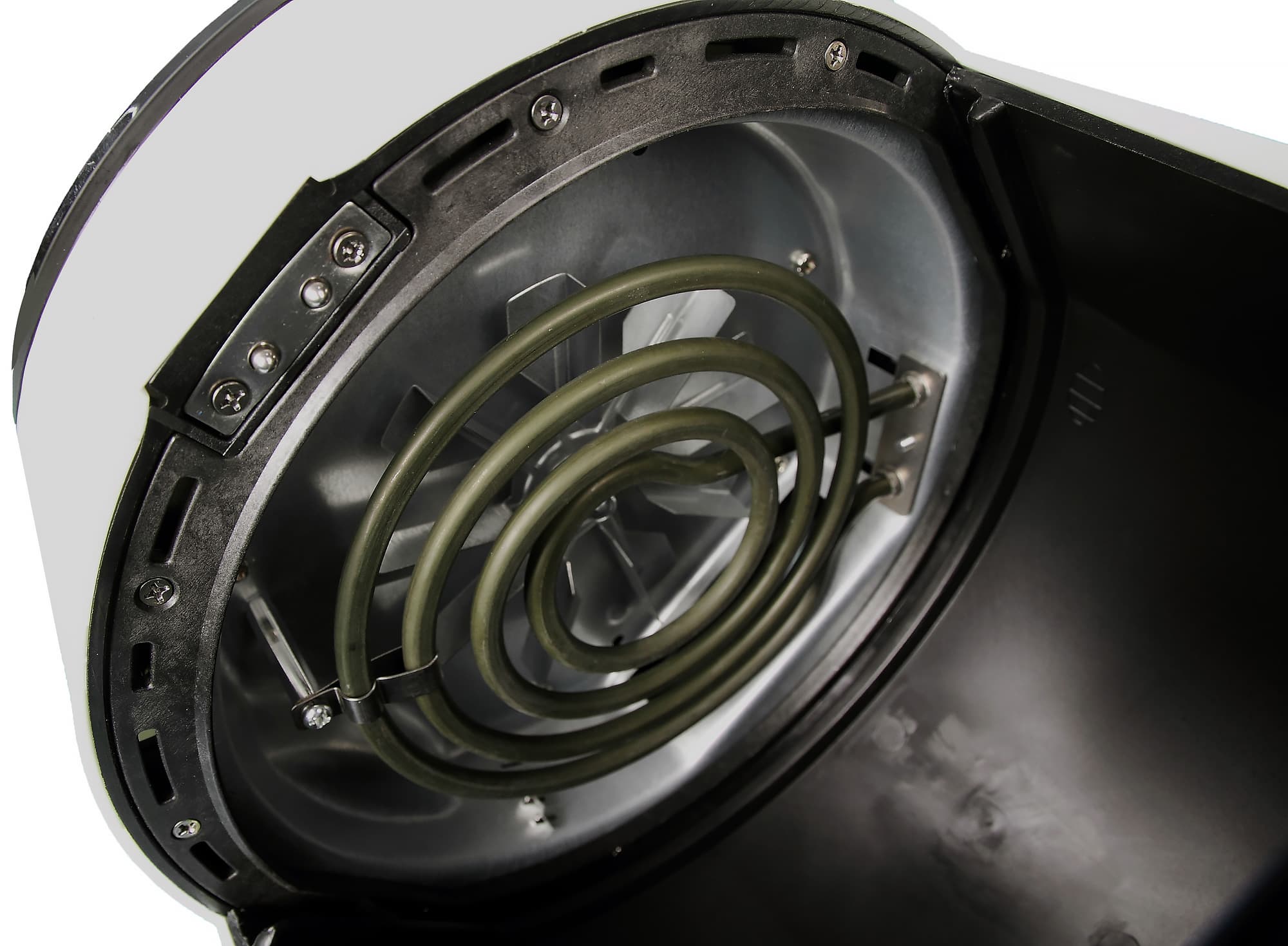 Чаша и корзина с антипригарным покрытием легко вынимаются из корпуса простым движением в горизонтальной плоскости. Внутри прибора мы видим алюминиевую поверхность, а заглянув в верхнюю часть, можно увидеть нагревательный элемент и вентилятор.