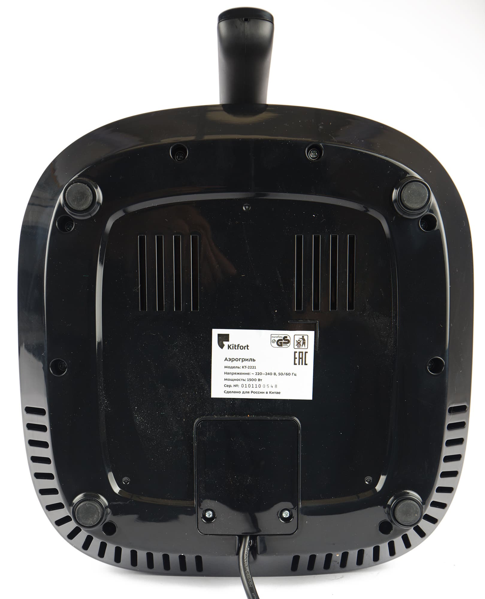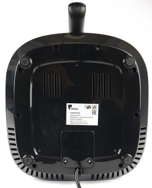 Аэрогриль имеет четыре небольшие прорезиненные ножки. Наклейка с серийным номером и основными характеристиками находится снизу.