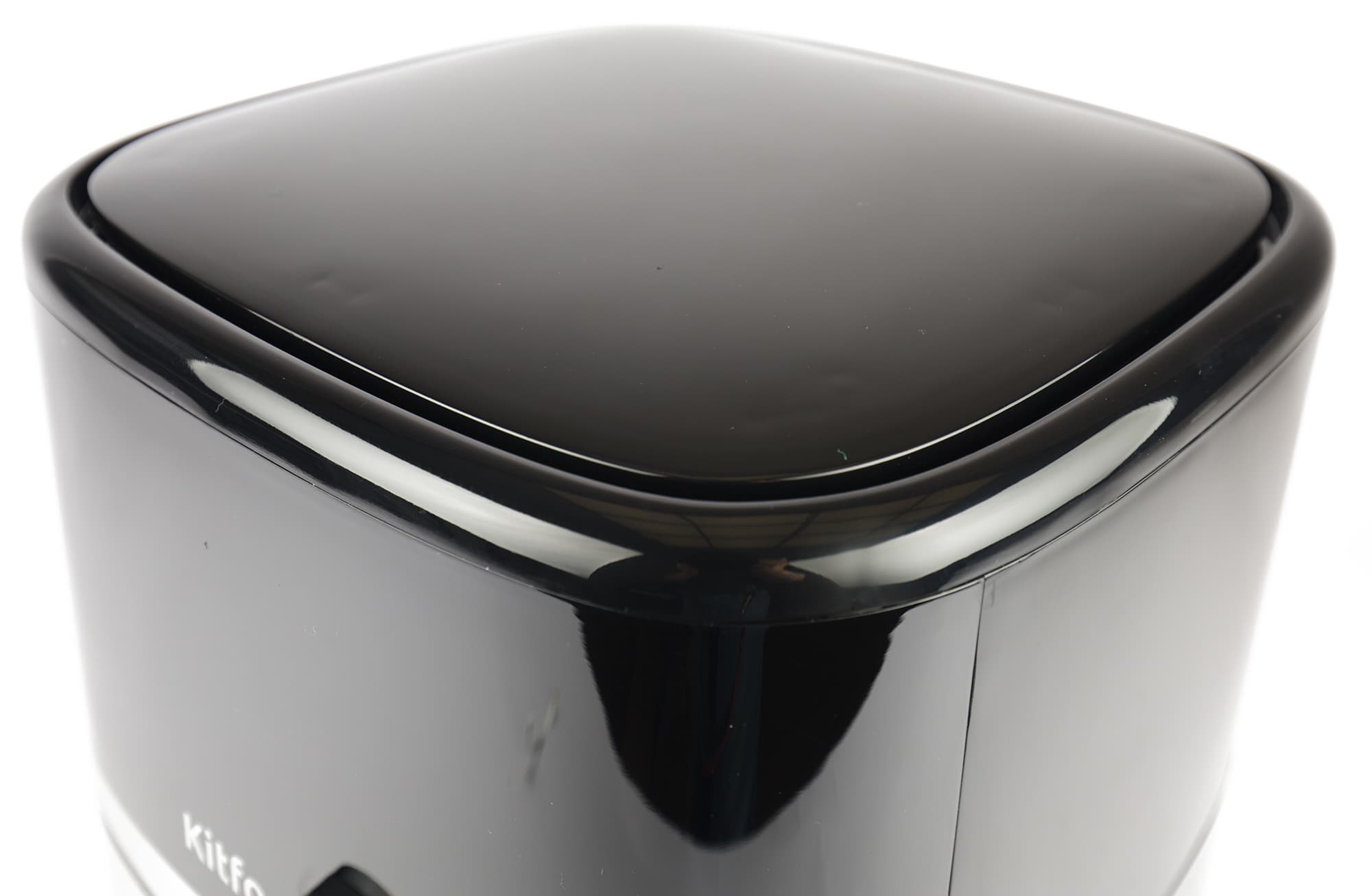 Первое, что хочется отметить в модели Kitfort КТ-2221 — это интересный дизайн. Прибор компактен, со скругленными углами и небольшой ручкой посередине корпуса, строгий черный цвет сочетается с серебристым металлом, никаких рекламных наклеек, только небольшой логотип на передней поверхности. Сначала совершенно непонятно что это за прибор, кофеварка, мультиварка или увлажнитель воздуха. Аэрогриль в нем не выдает ничего.