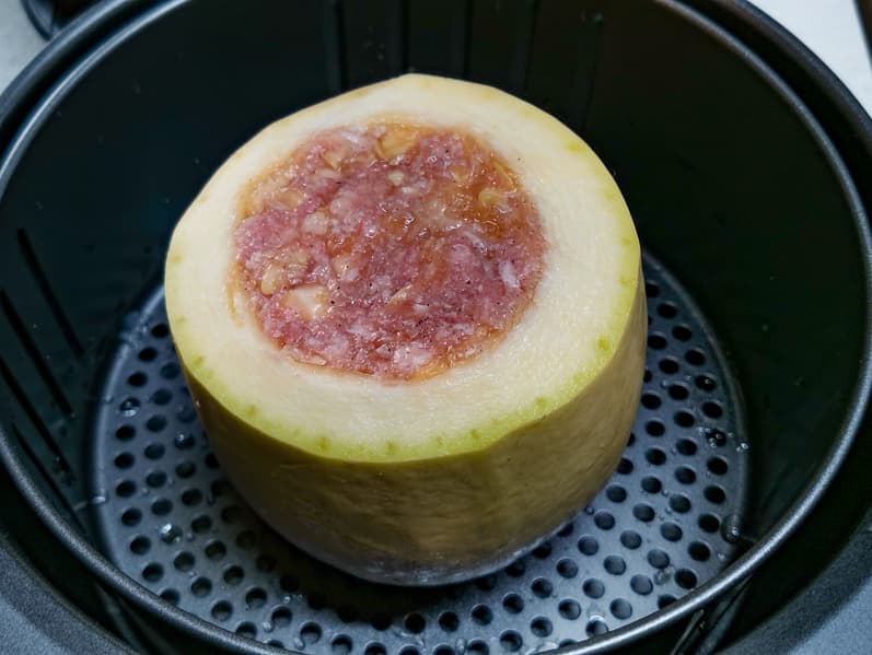 Мы взяли крупный кабачок, фарш, рис и специи. Кабачок подрезали по высоте по размеру корзинки аэрогриля, вынули середину с семенами. Положили внутрь фарш с рисом и специями.