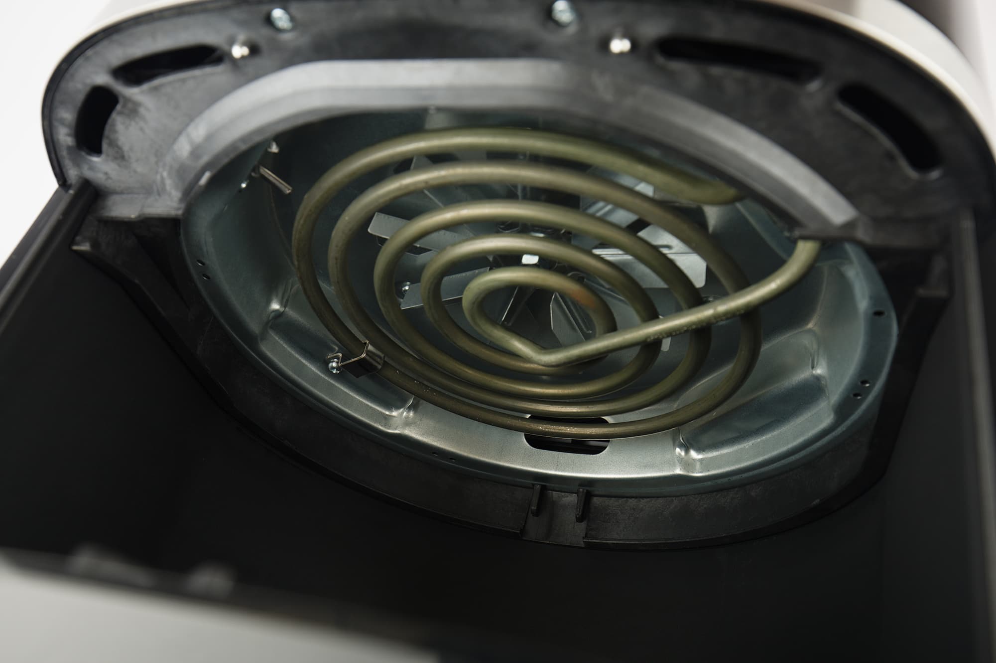 Нагревательный элемент расположен сверху корпуса, если специально не заглядывать, он не виден. Над ним находится вентилятор, который создает воздушные потоки от нагретого тэна.
