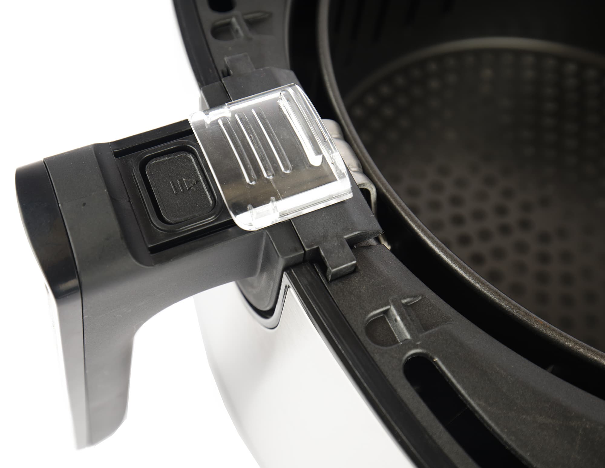 На ручке специальная пластиковая защитная крышка. Она закрывает кнопку отсоединения корзины от поддона. Если крышку не сдвинуть, кнопка не видна и случайного нажатия не произойдет.