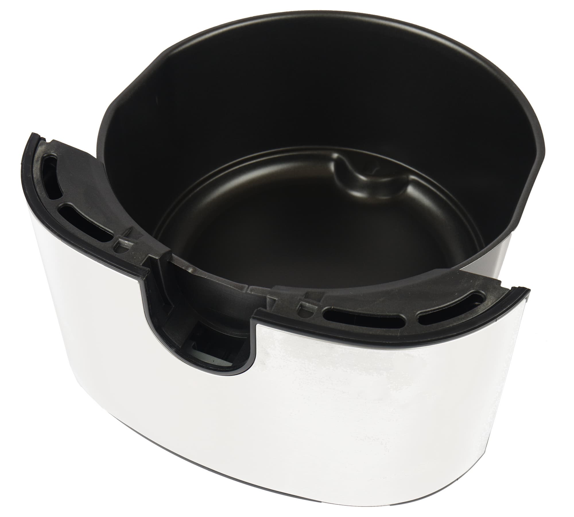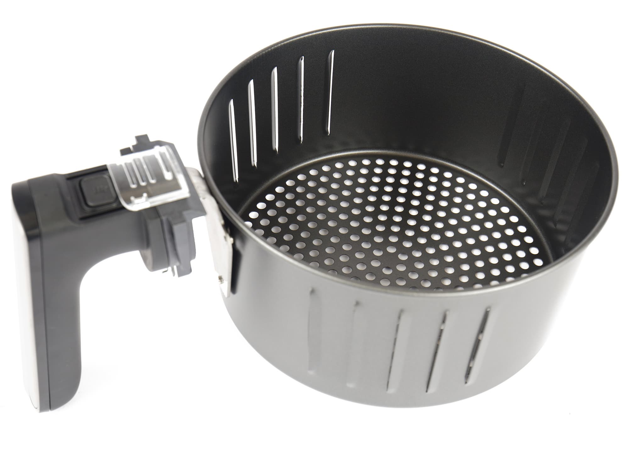В поддон вставляется загрузочная корзинка. Она представляет собой металлическую емкость с перфорацией и антипригарным покрытием. Через перфорированные круглые дырочки и прорези в емкость поступает горячий воздух.
