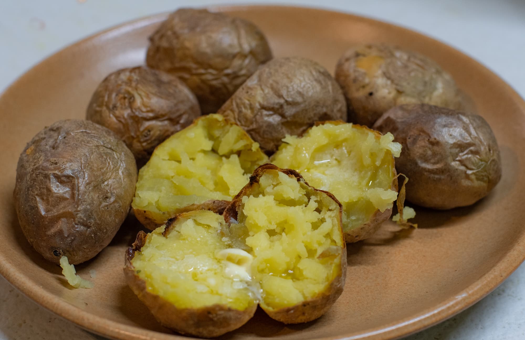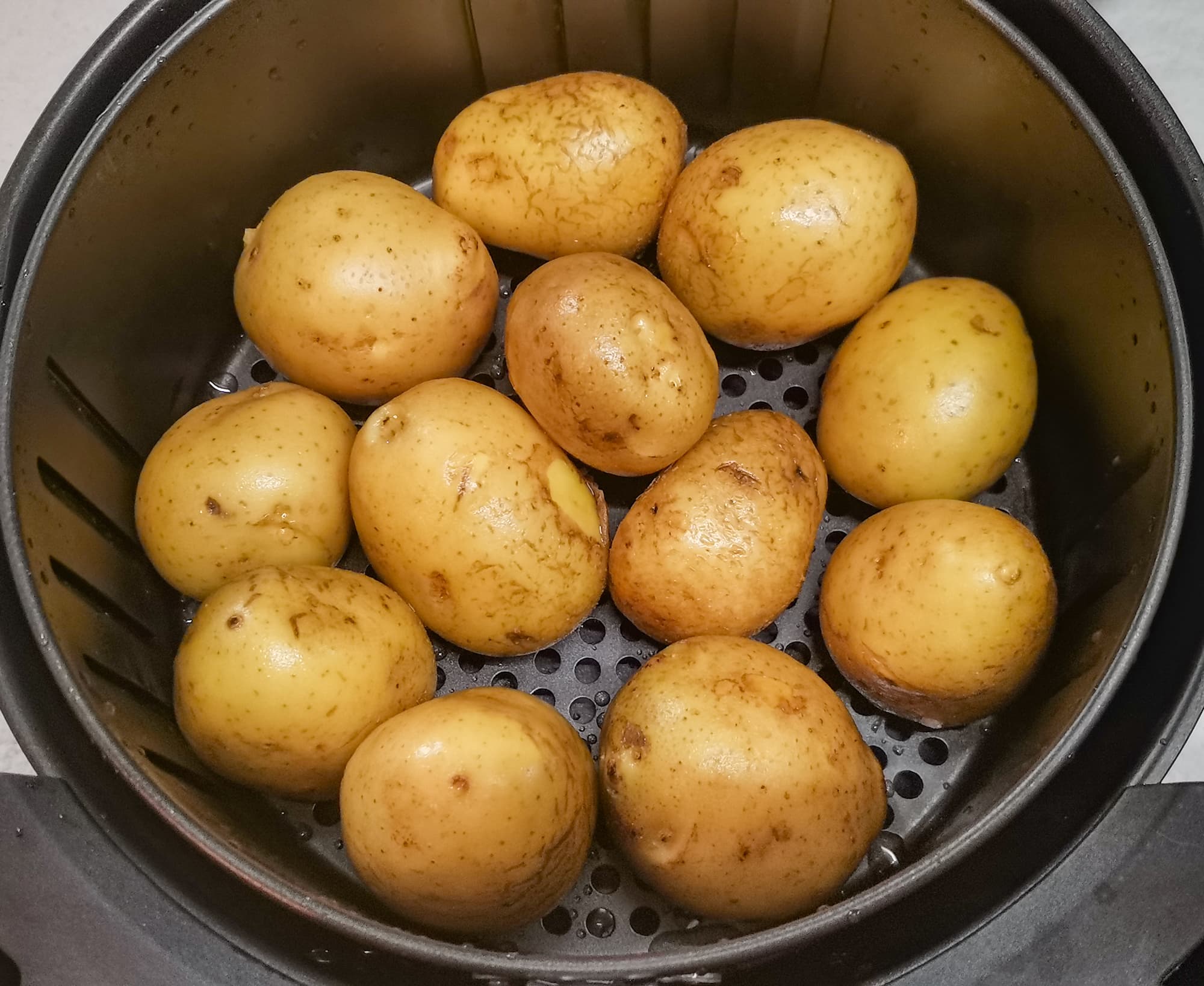 Баклажаны запеклись отлично, как и картошка. Двум вымытым овощам с обрезанными хвостиками хватило получаса при температуре 190 °C.