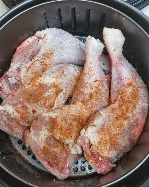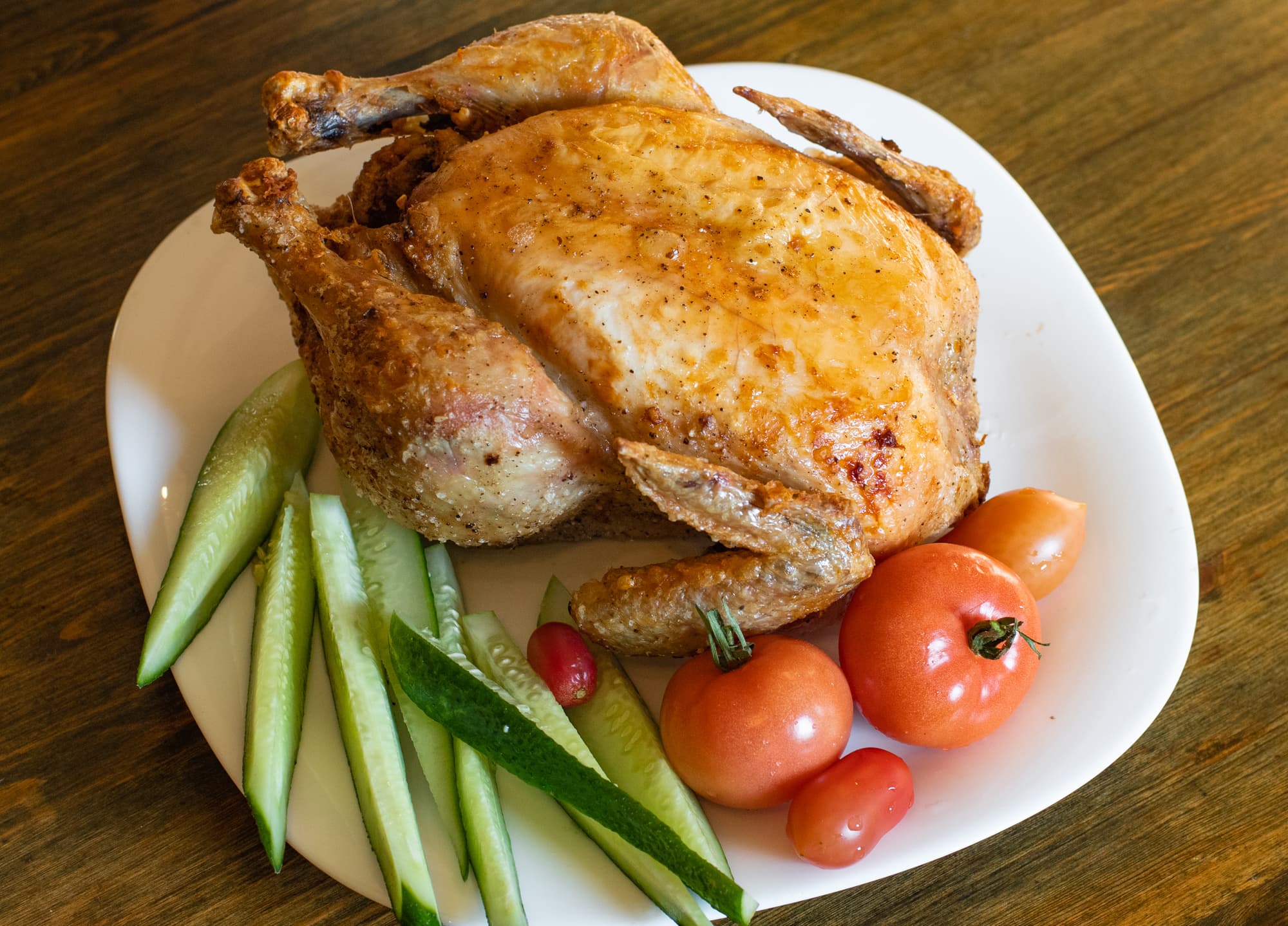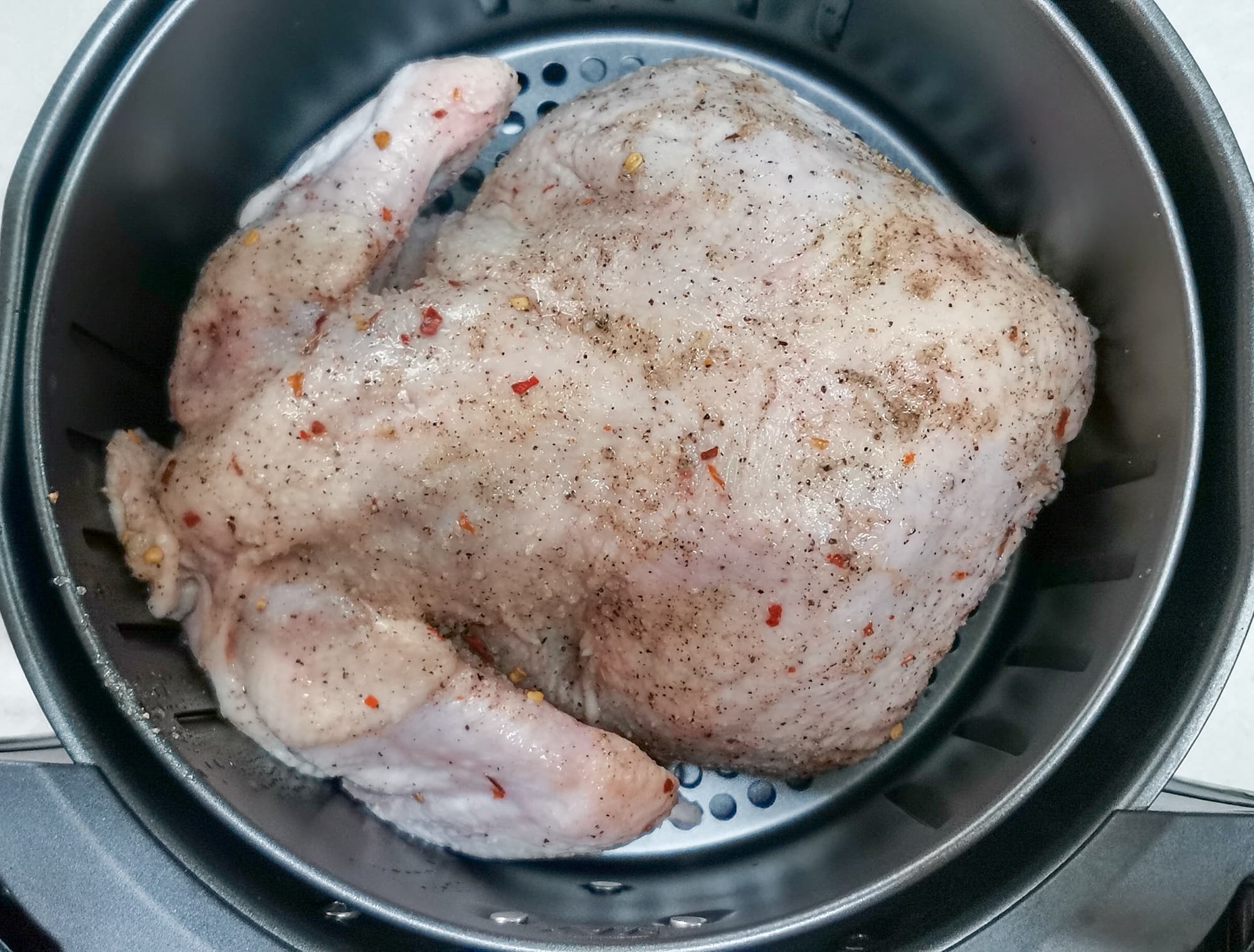 В предыдущей модели аэрогриля Kitfort курица получалась отлично. Мы решили проверить, как скажется на качестве прожарки отсутствие в КТ-2221 функции вращения. Мы взяли курицу весом около 1700 г, натерли солью и перцем, положили в чашу гриля.