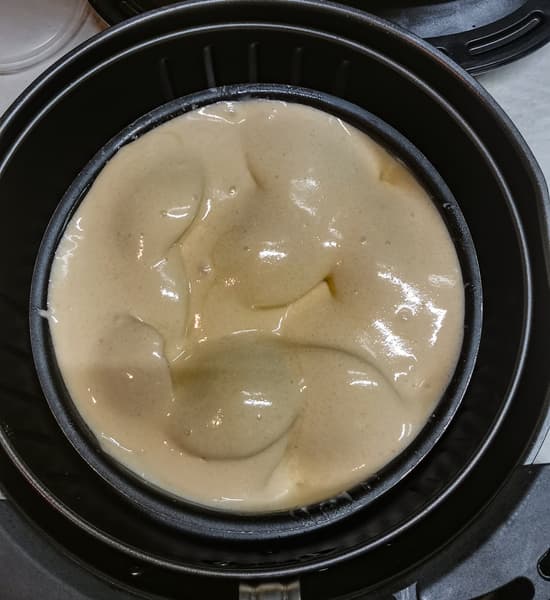 Для шарлотки мы подобрали чашу с антипригарным покрытием, по высоте подходящую к аэрогрилю. Шарлотку делали по быстрому рецепту из кислых яблок, слив, муки, яиц, сахара и разрыхлителя.