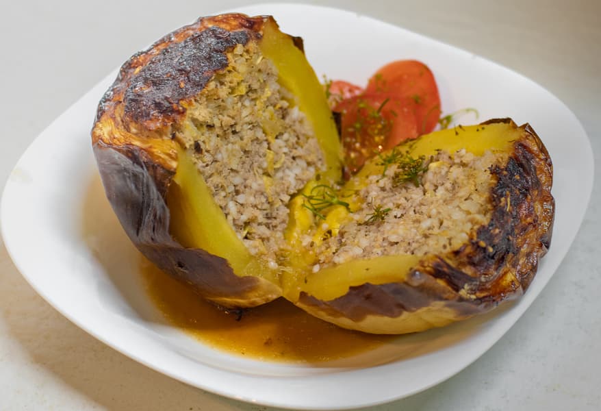 По прошествии 45 минут вынули, проверили готовность. Так как кабачок был даже чуть выше корзины, он почти упирался в тэн прибора, поэтому верх немного подгорел. Это можно исправить, если не располагать продукты настолько высоко. В остальном блюдо получилось хорошо, начинка из фарша и риса полностью приготовилась, кабачок хорошо запекся и остался сочным. Однозначно лучше, чем приготовленный в кастрюле. В процессе запекания жидкость из кабачка практически не выделялась, корзина гриля осталась чистой. Овощ дал сок уже в процессе разрезания.
