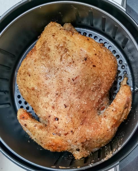 На аэрогриле с тушкой курицы установили 190 °C, готовили 45 минут без вмешательства в процесс. Через 45 минут вынули, перевернули, так как снизу прожарилось чуть хуже, и оставили еще на 15 минут. Результат оказался отличный.