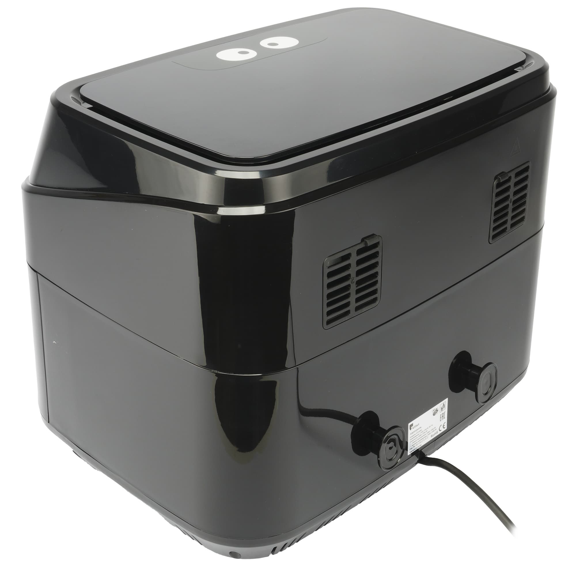 Первое, что хочется отметить в модели Kitfort КТ-2250 — это аккуратный, неброский, но стильный дизайн. Прибор достаточно большого размера, со скругленными углами и двумя крупными ручками посередине корпуса, строгий черный глянцевый пластик хорошо сочетается с серебристыми вставками, никаких рекламных наклеек, только небольшой логотип на передней поверхности и милая съемная наклейка с глазами на верхней панели.