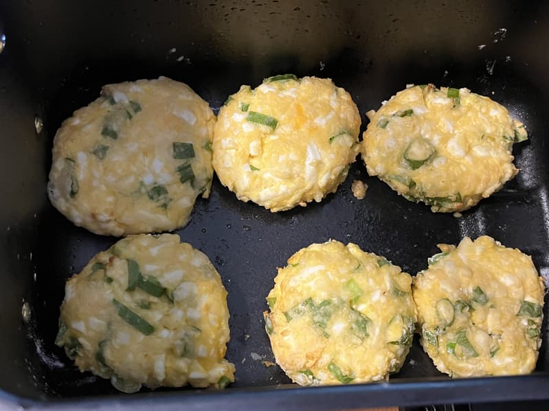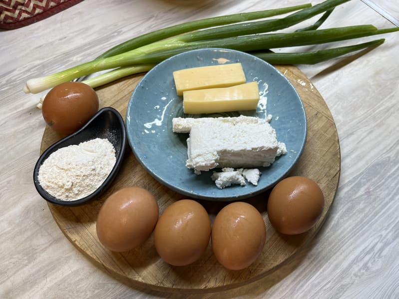 Для них нам потребовались такие продукты: 150 г творога, 100 г сыра, 4 вареных яйца и 1 сырое, 2 ст. л. муки и несколько перьев молодого зеленого лука.