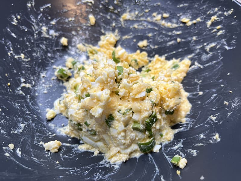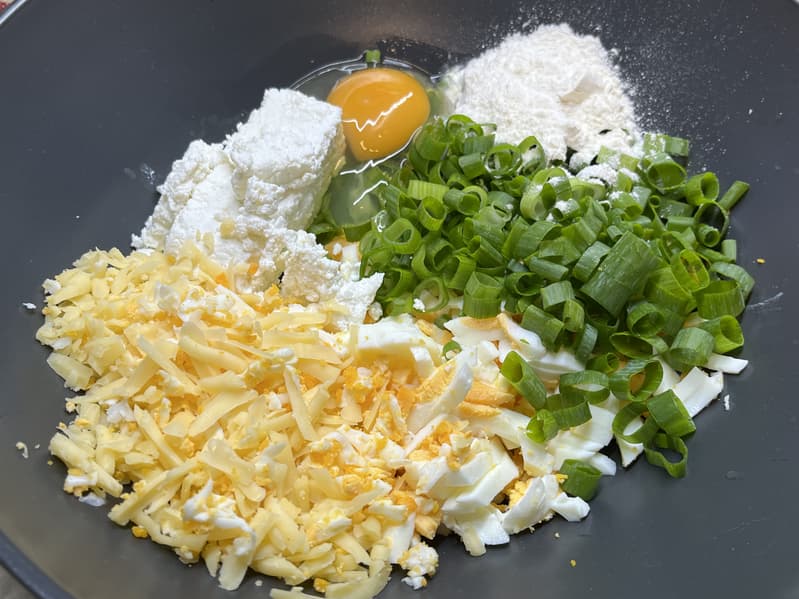 Мы порезали лук и отварные яйца, натерли сыр и добавили прочие ингредиенты. Всё перемешали и приступили к лепке самих «пирожков».