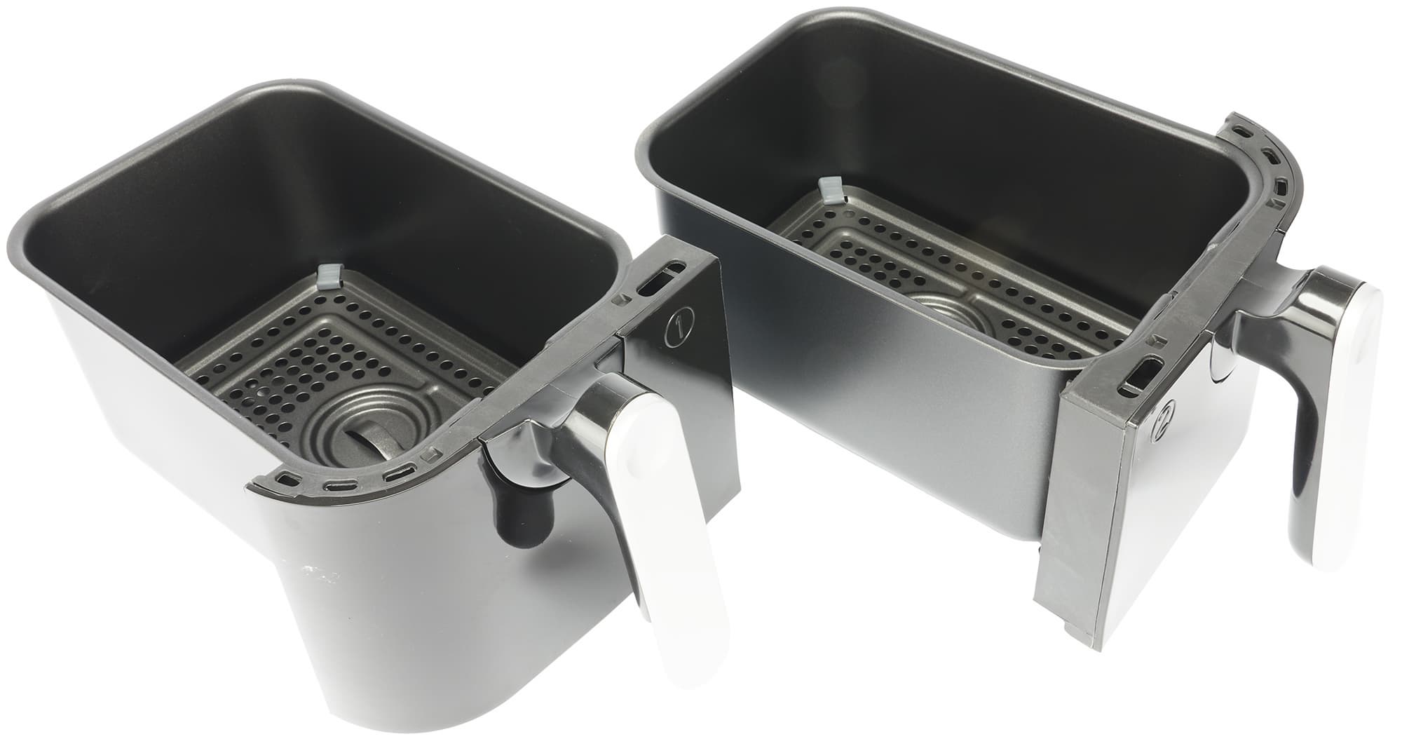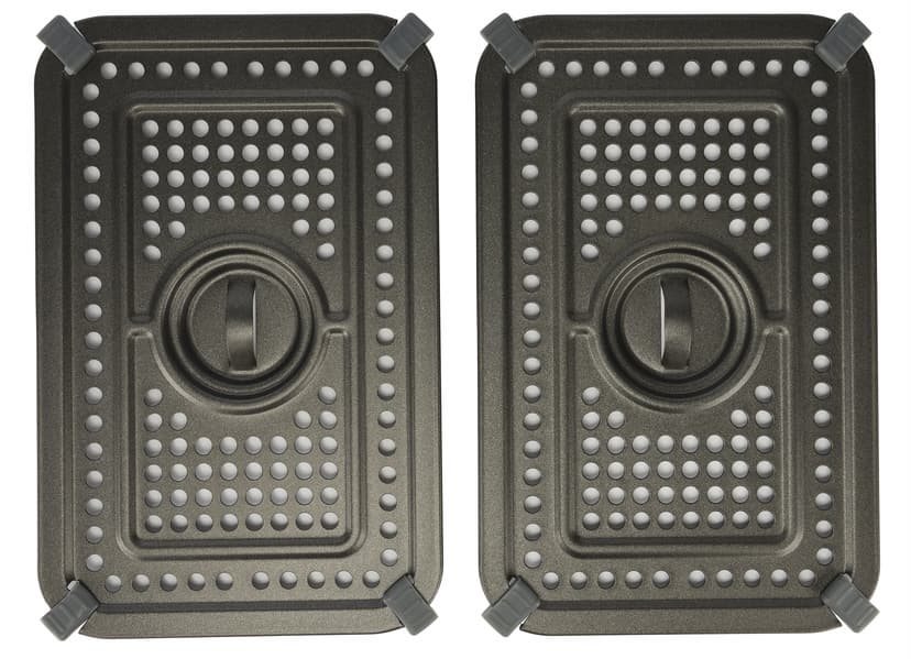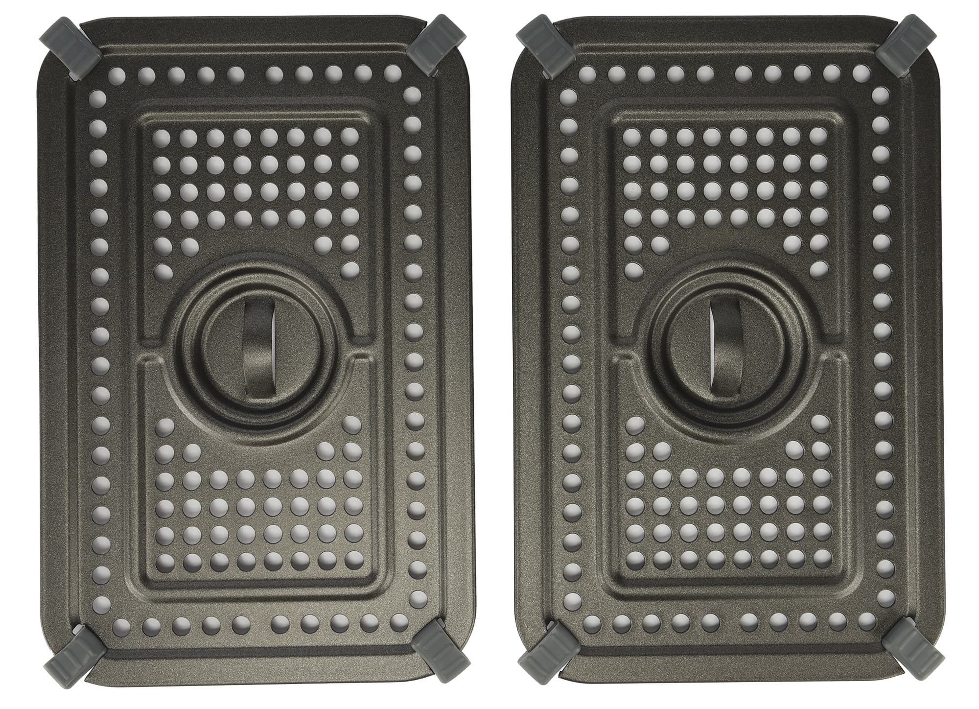 У каждой решетки в центре есть небольшие ручки, за которые их удобно вынимать из чаш. А по углам закреплены силиконовые прокладки, которые помогают пластинам надежно держаться внутри даже при наклоне лотков, но при этом не царапать их антипригарную поверхность.
