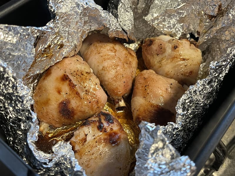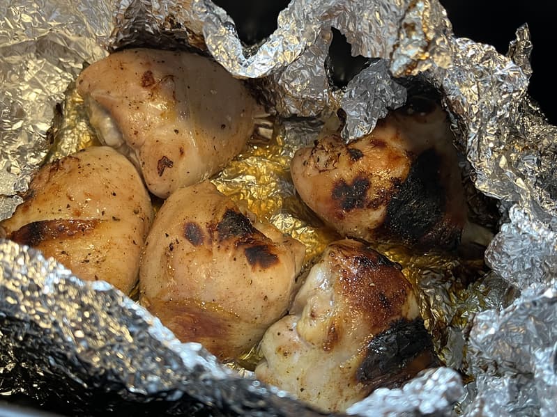 Часть куриных ножек поджарилась чуть больше, чем хотелось бы, но мы связываем это с тем, что оставили отверстия в фольге: стоило либо совсем не накрывать мясо, либо не оставлять открытых мест.