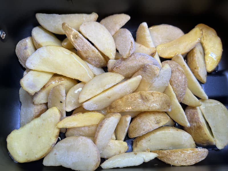 Картофель полностью приготовился за 15 минут при 200 градусах на режиме «Картошка-фри» и не разочаровал по равномерности обжарки.