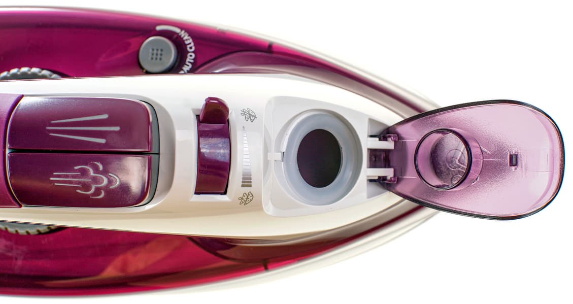 Резервуар для воды изготовлен из прозрачного пластика фиолетового цвета. Уровень воды виден достаточно хорошо. Заявленный объем в 320 мл представляется нам более чем достаточным как для глажения с постоянной подачей пара, так и для вертикального отпаривания. Крышка резервуара откидывается с усилием, закрывается со щелчком. Диаметр отверстия для заливки воды составляет 1,6 см. При использовании комплектного стаканчика для заполнения утюга водой никаких проблем не возникает.