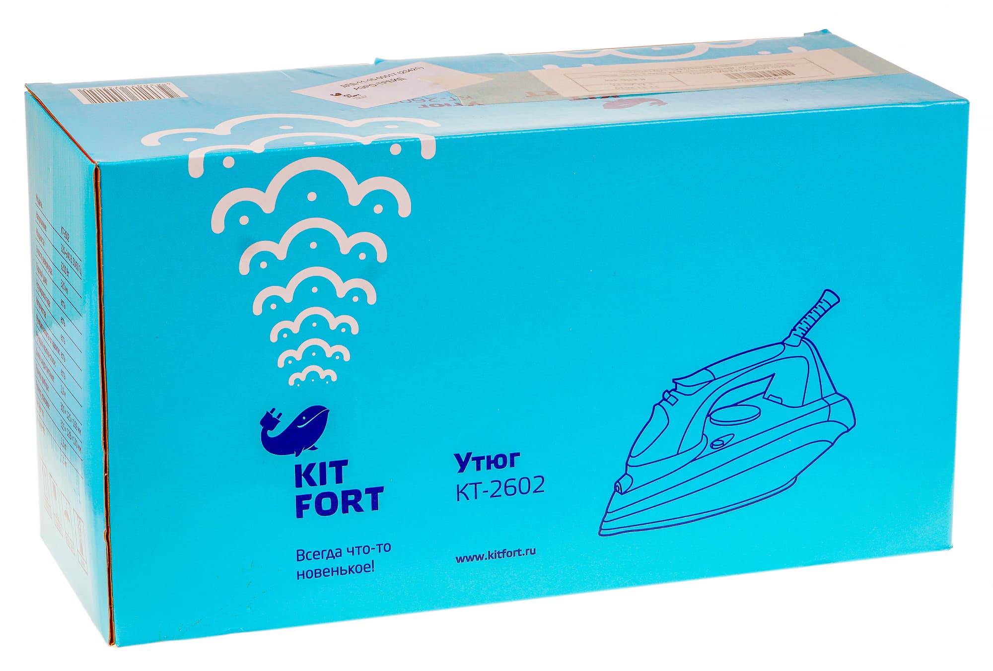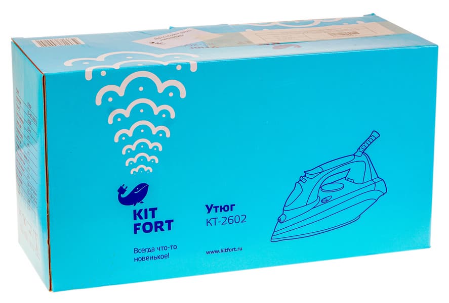 Утюг упакован в картонную коробку небольшого размера. Одноцветная голубая коробка оформлена типовым для Kitfort образом: логотип, слоган, название и модель устройства на фронтальных сторонах, технические характеристики и описание прибора — на боковых. Ручкой для переноски упаковка не оснащена.