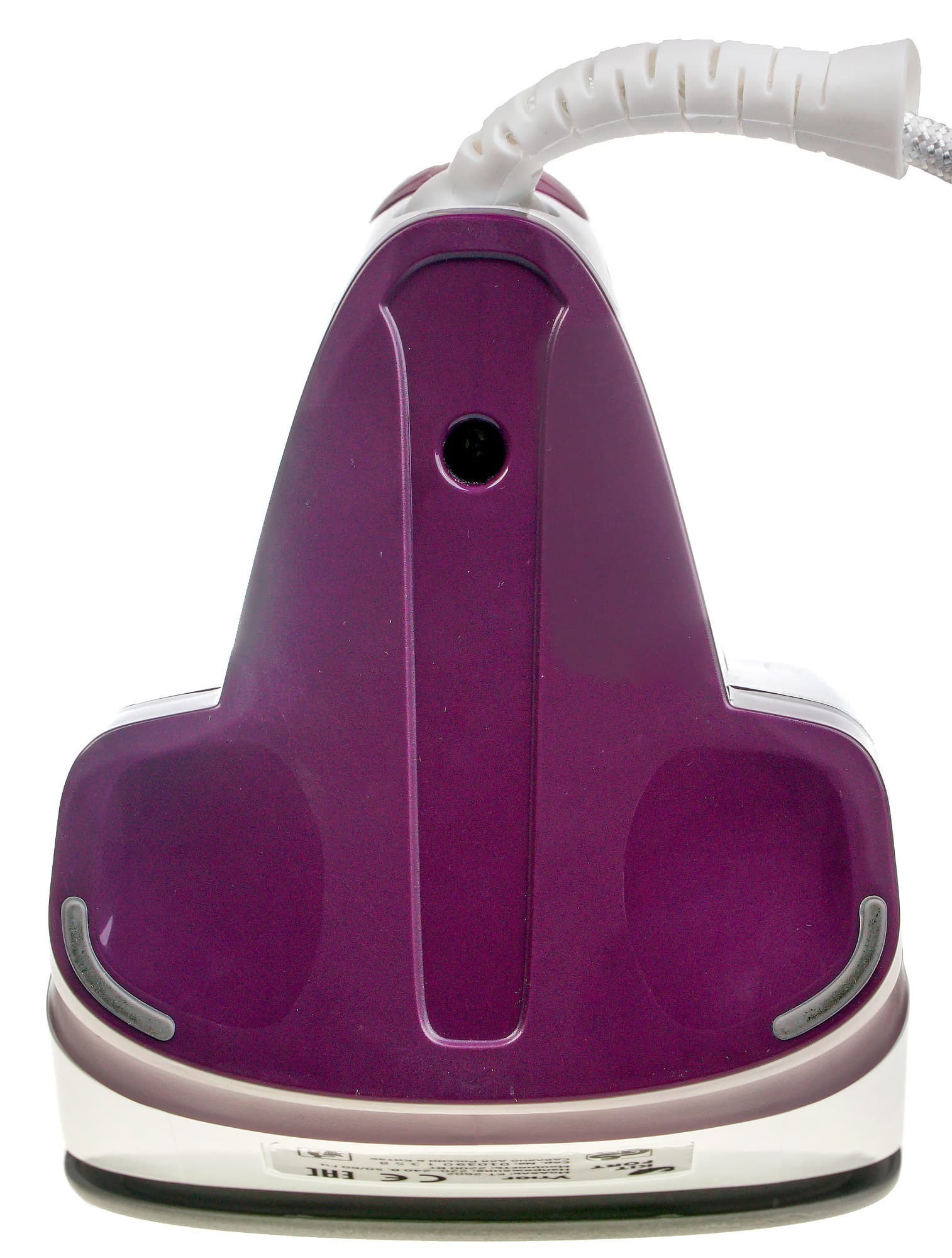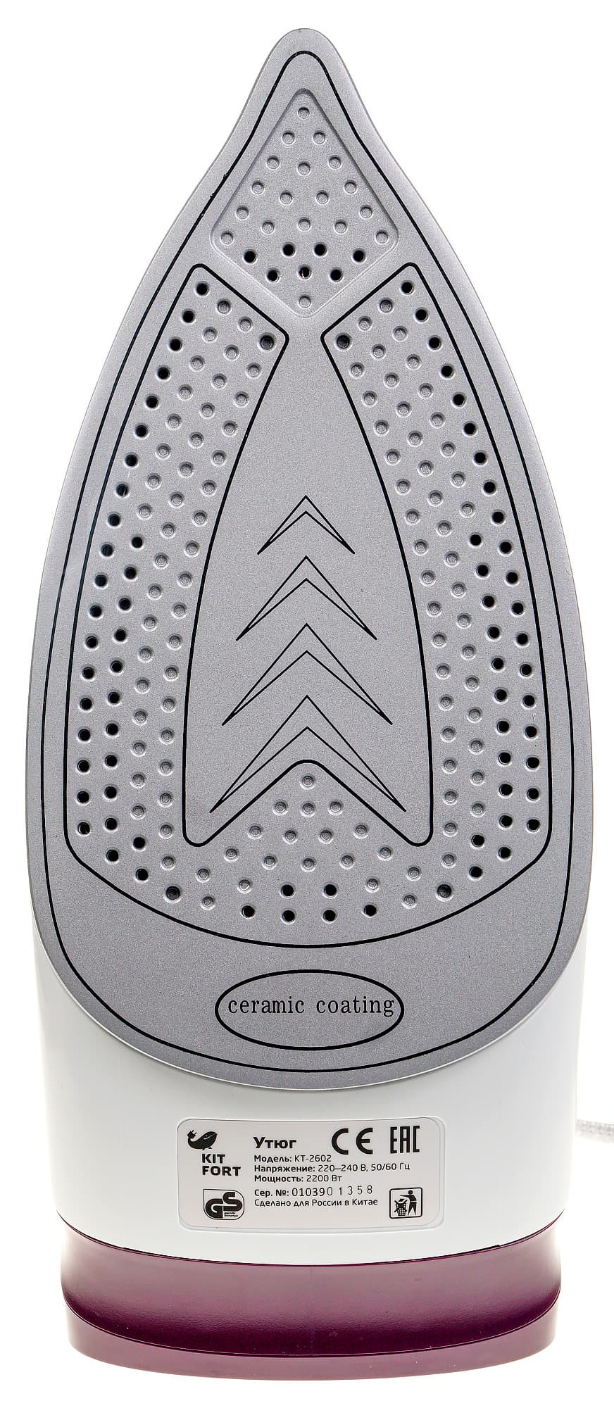 Со стороны подошвы в нижней части корпуса можно увидеть наклейку-шильдик с информацией об утюге. Форма подошвы — обычная треугольная с округлыми гранями, скругленными углами и зауженной вершиной. Подошва обработана керамическим покрытием, о чем свидетельствует надпись «ceramic coating». Поверхность гладкая, без зазубрин и царапин. Местами в один, а местами и в два ряда расположены отверстия выхода пара.