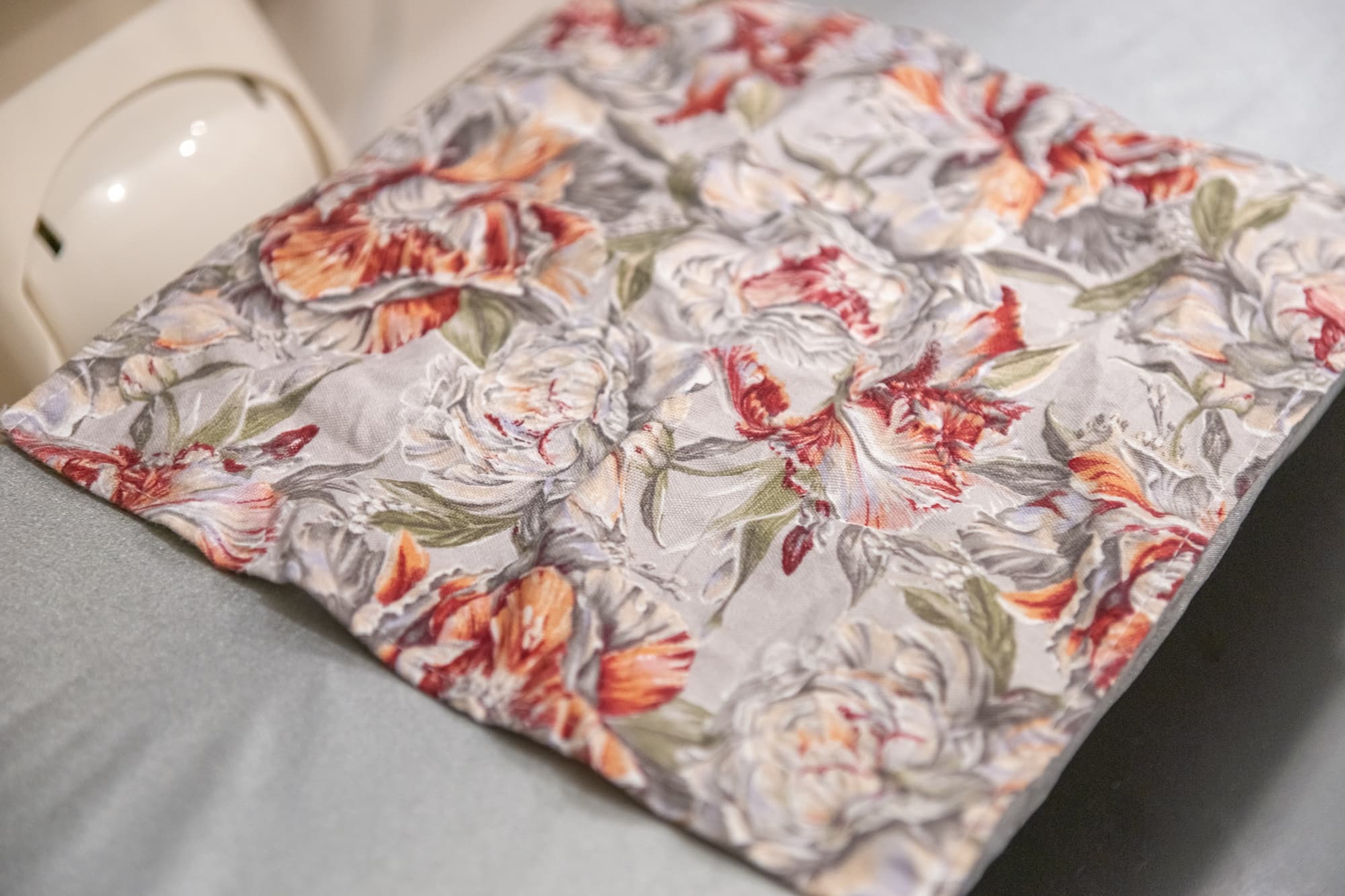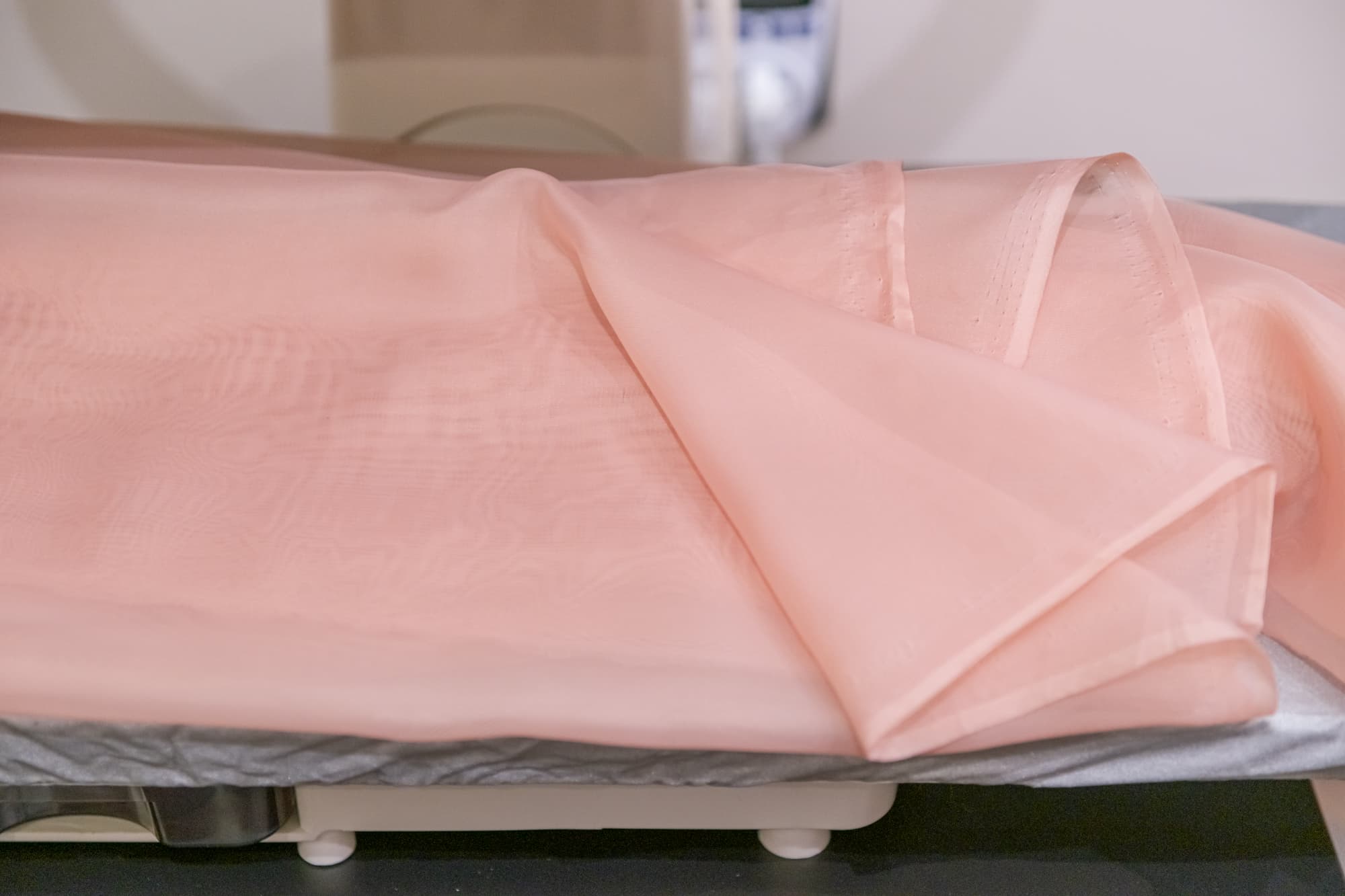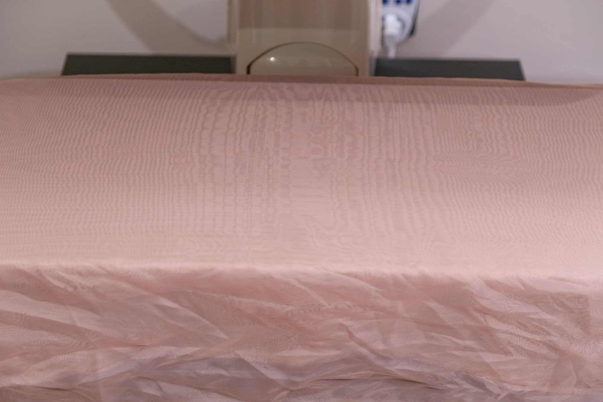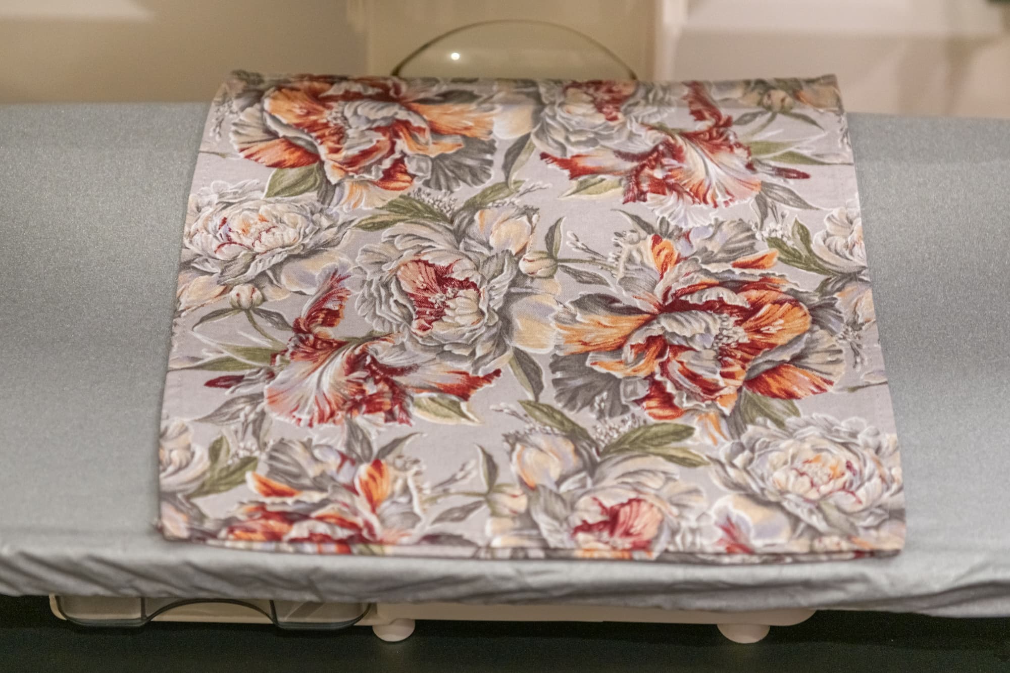 Плотная тяжелая портьерная ткань с тиснением давно лежала в сложенном виде и местами приобрела заломы. Обработку паром мы сочетали с придавливанием панелью, нагретой на максимальной температуре в режиме Linen. Пара движений прессом по одному и тому же месту позволили разгладить почти все серьезные замятия, оставив лишь небольшие складки.