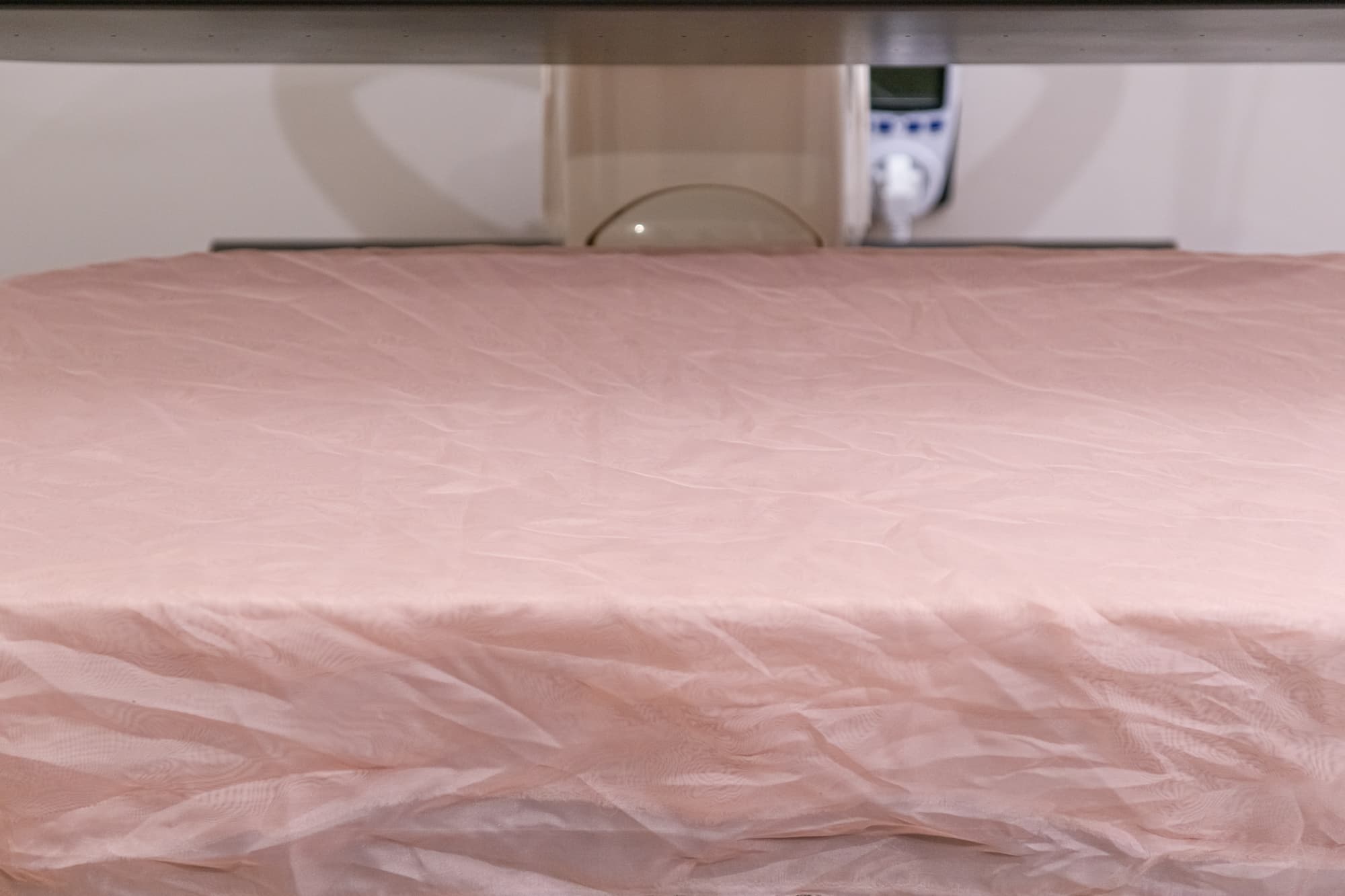 Простынь обрабатывалась сложенной вдвое, но наше изделие было на резинке, поэтому края мы раскладывали в один слой, натягивая резинку на один край доски. С простыней без резинки было бы намного проще и быстрее.