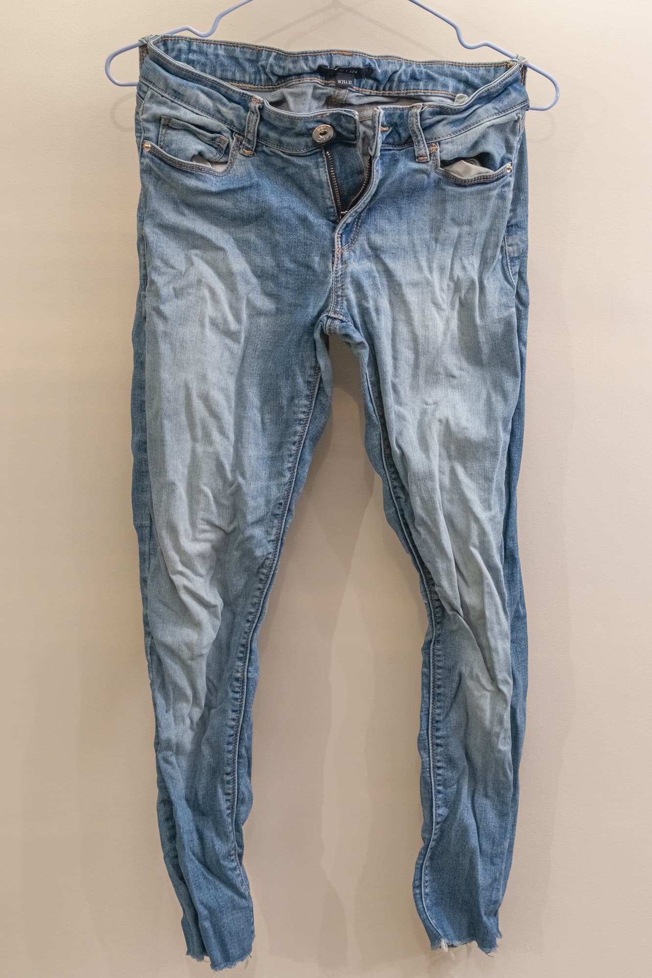 Джинсы специально для этого теста были измяты при стирке отжимом на высоких оборотах и высушены на батарее. Для удаления складок и заломов мы по очереди разложили на доске каждую штанину, добавили пар и прижали ее с обеих сторон по одному разу. Гладильный пресс работал в режиме Linen.