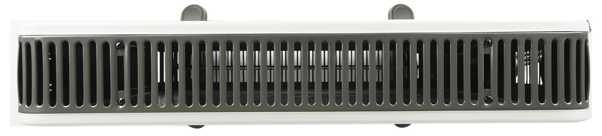 Перед нами небольшой плоский обогреватель неярко-белого цвета с вентиляционными прорезями сверху корпуса. Посередине едва заметный логотип производителя. Металл корпуса достаточно толстый.