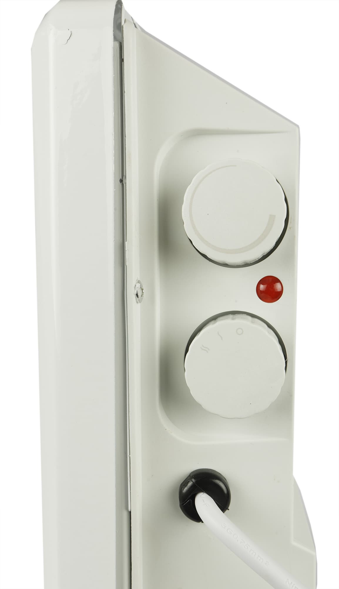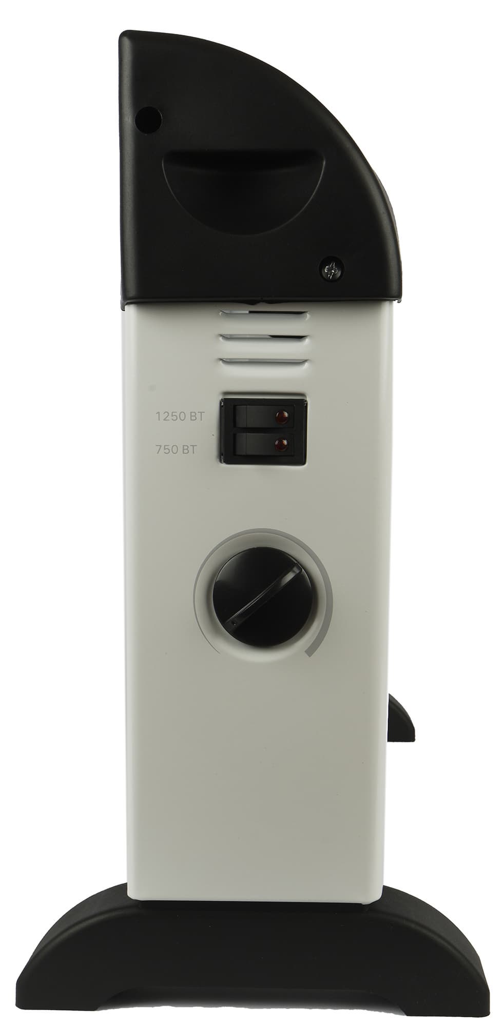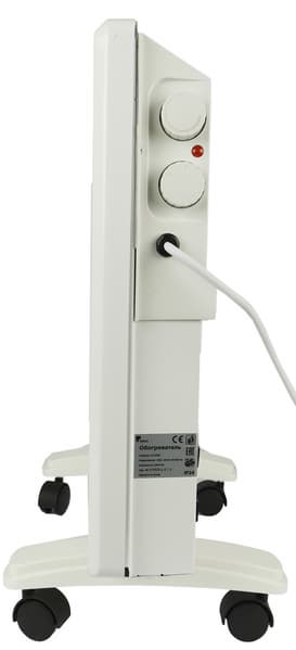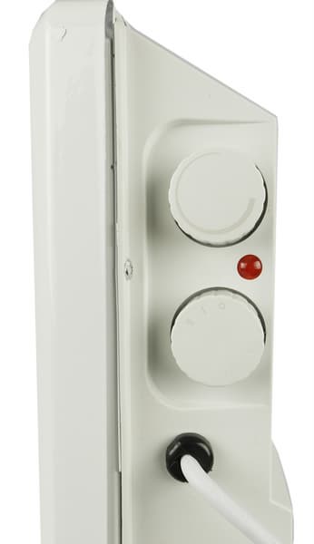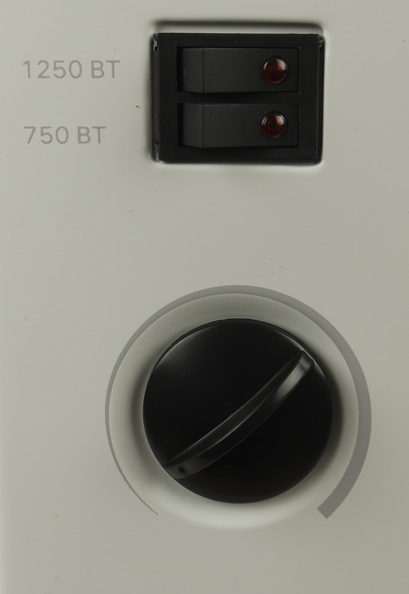 На боковой поверхности конвектора располагаются два переключателя с индикаторами и ручка термостата. Переключатели служат для выбора мощности. Возможно три уровня — 750 Вт, 1250 Вт, 750+1250 Вт. Ручка термостата регулирует подачу тепла, то есть время работы при выставленной мощности. При достижении определенной температуры обогреватель прекращает работу, после остывания термостата — возобновляет.
