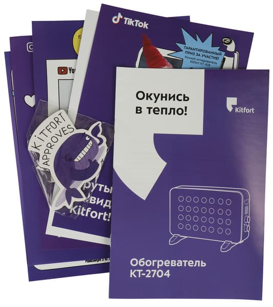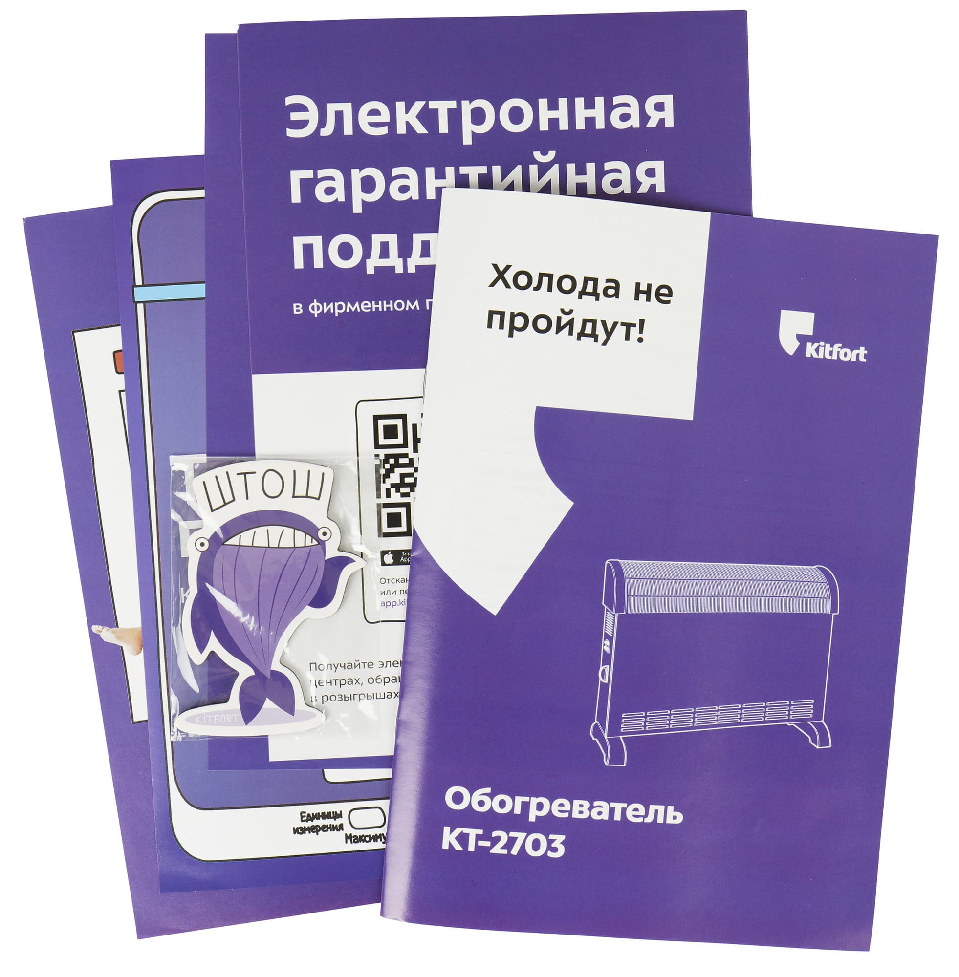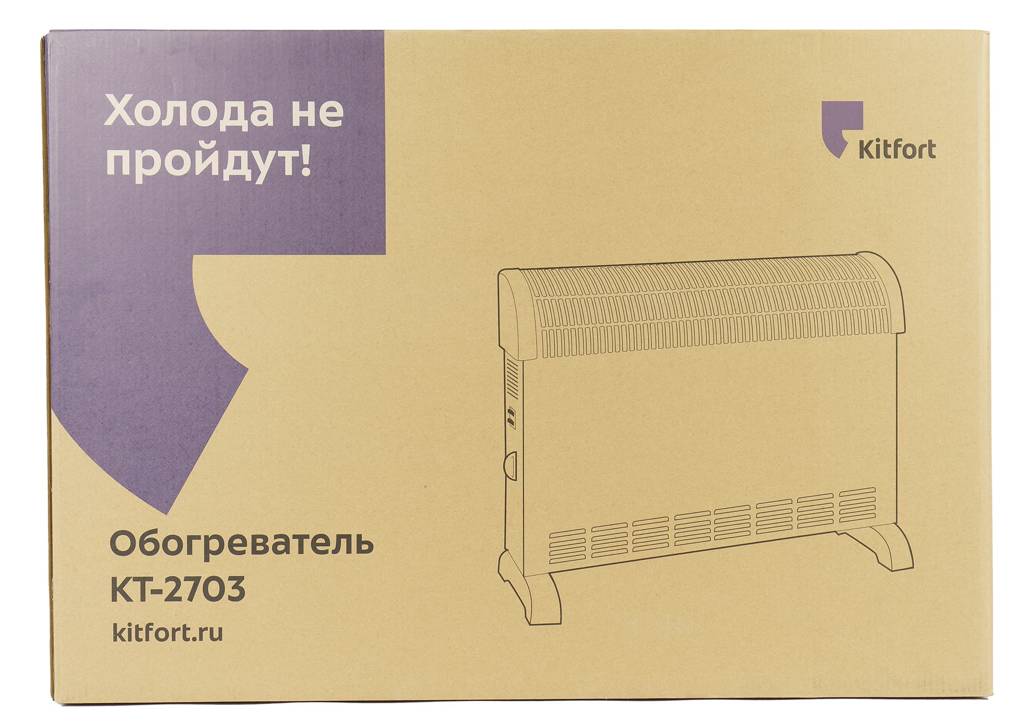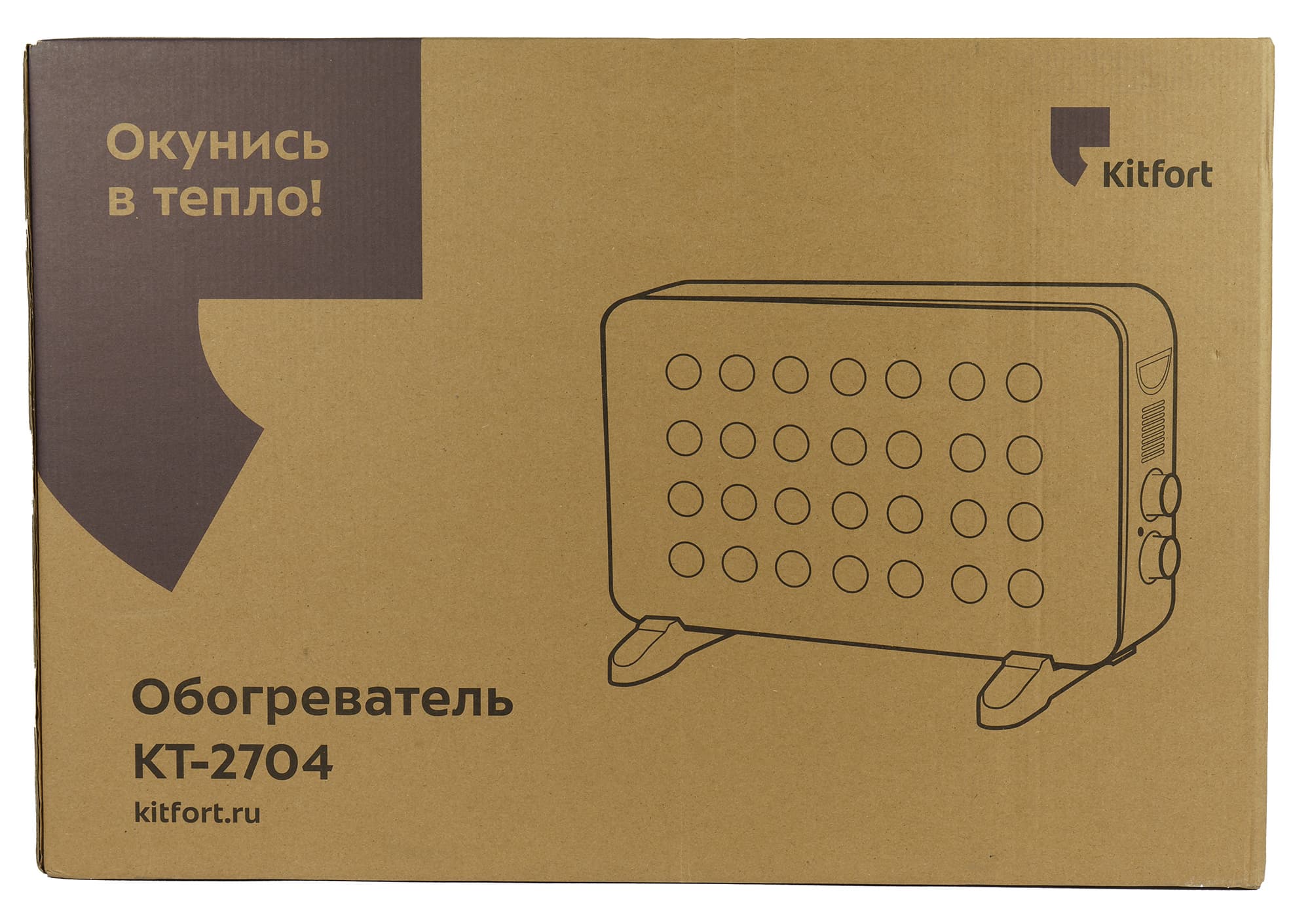 Kitfort KT-2704 упакован в коробку с габаритными размерами 640×145×440 мм. Коробка из технического картона с двухцветной полиграфией, без ручек или прорезей. Вес коробки вместе с прибором — 3,6 кг. Конвектор раскреплен внутри с помощью пенопластовых вставок.