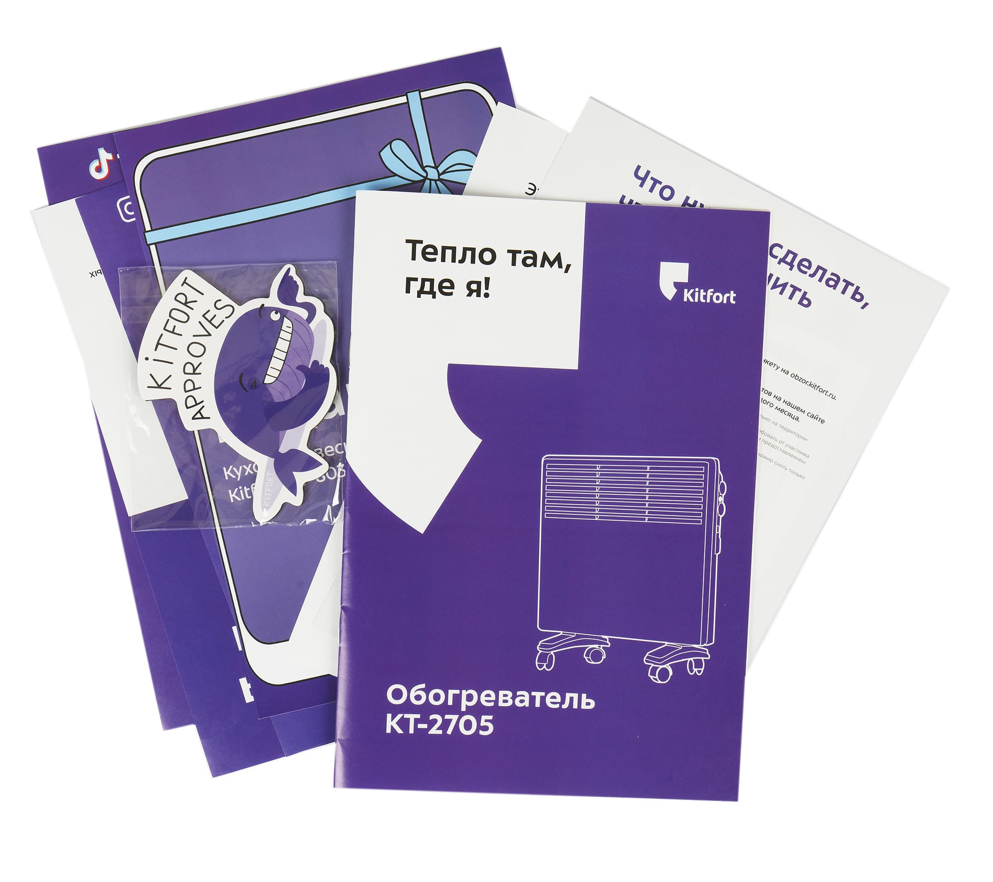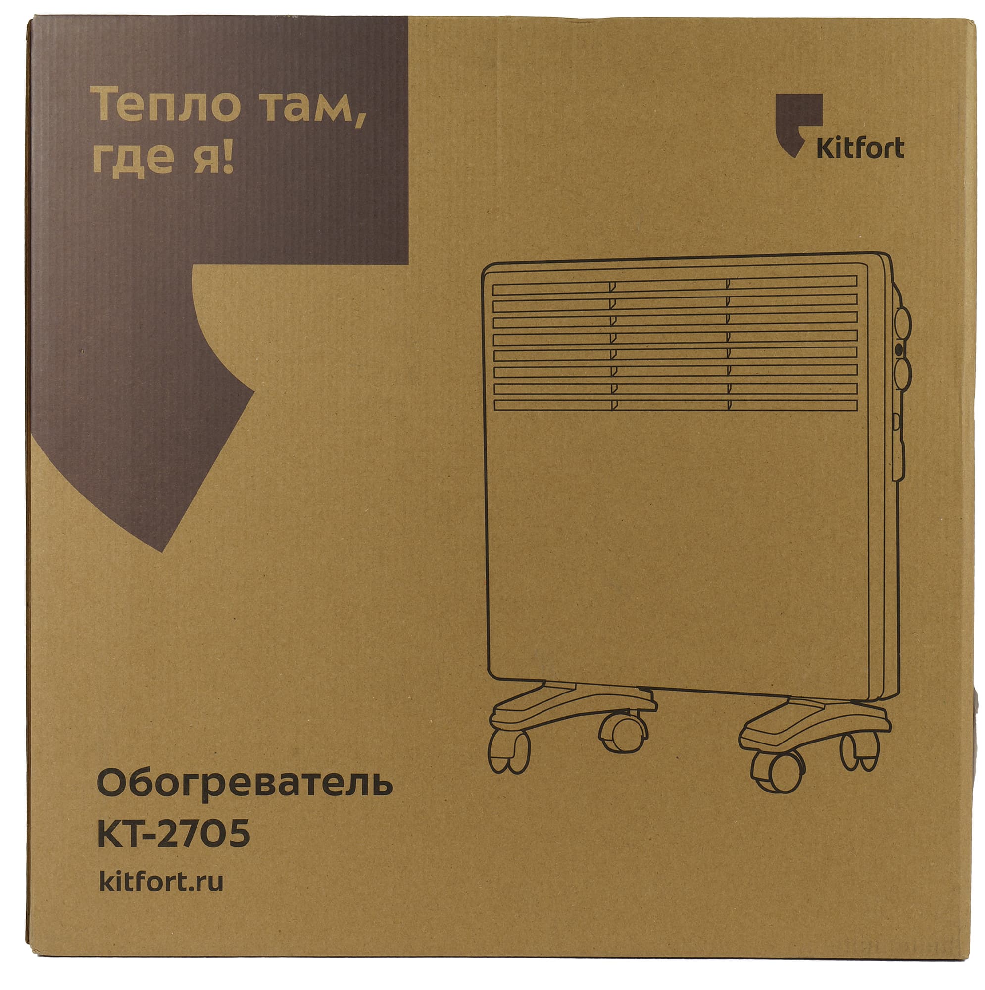 Kitfort KT-2705 упакован в коробку с габаритными размерами 510×120×500 мм. Коробка из технического картона с двухцветной полиграфией, с техническими характеристиками прибора, без ручек или прорезей. Вес коробки вместе с прибором 4,4 кг. Конвектор раскреплен внутри с помощью пенопластовых вставок.