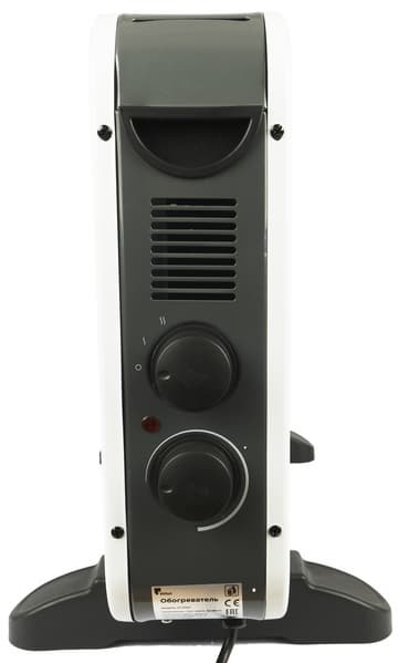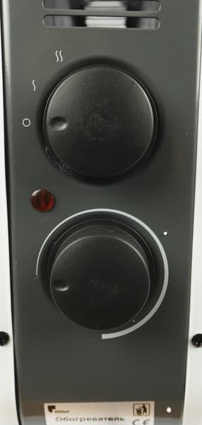 Ручки небольшие и не очень удобные для регулировки. Во-первых, абсолютно непонятно, куда нужно повернуть ручку для установки режима или температуры — на корпусе нет соответствующих отметок. Во-вторых, сами ручки не очень удобно захватываются, а если прибор стоит на земле, нужно наклоняться, крутить ручки и внимательно смотреть на зажигающийся светодиод, чтобы понять на какой режим и мощность обогреватель включился. Режимов два: максимальная мощность и половина от нее. Термостат регулирует температуру, при достижении которой прибор отключает подачу питания. Мы насчитали 8 ступеней регулировки.