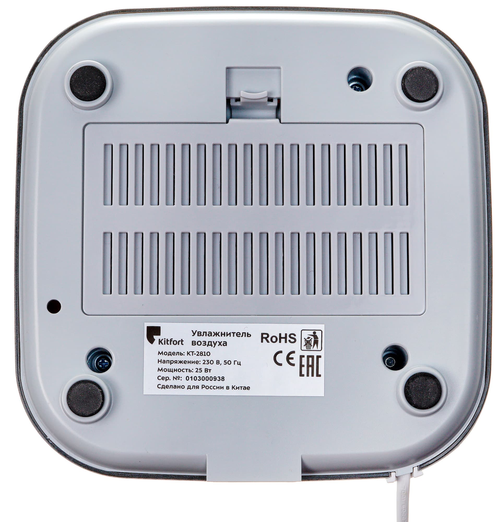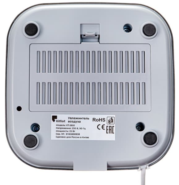Очень важно содержать в чистоте не только само устройство, но и поверхность, на котором оно стоит. У Kitfort KT-2810 нижний воздухозабор, поэтому если он стоит на пыльной полке, то пыль будет попадать в воду, несмотря на поролоновый фильтр в основании.