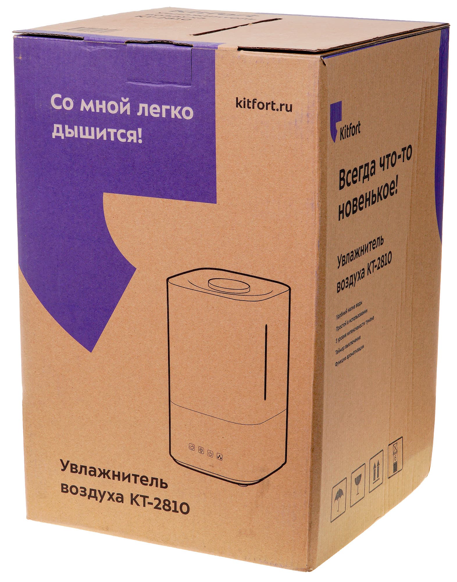Вертикальная коробка Kitfort KT-2810 сделана из крафтового картона с фиолетовыми вставками. Все ее боковые стороны одинаковые, поэтому те, которые расположены по ходу открывания крышки, назовем передней и задней. На них мы видим одинаковые схематические изображения прибора, лозунг для увлажнителей: «Со мной легко дышится», адрес сайта производителя и полное название модели.